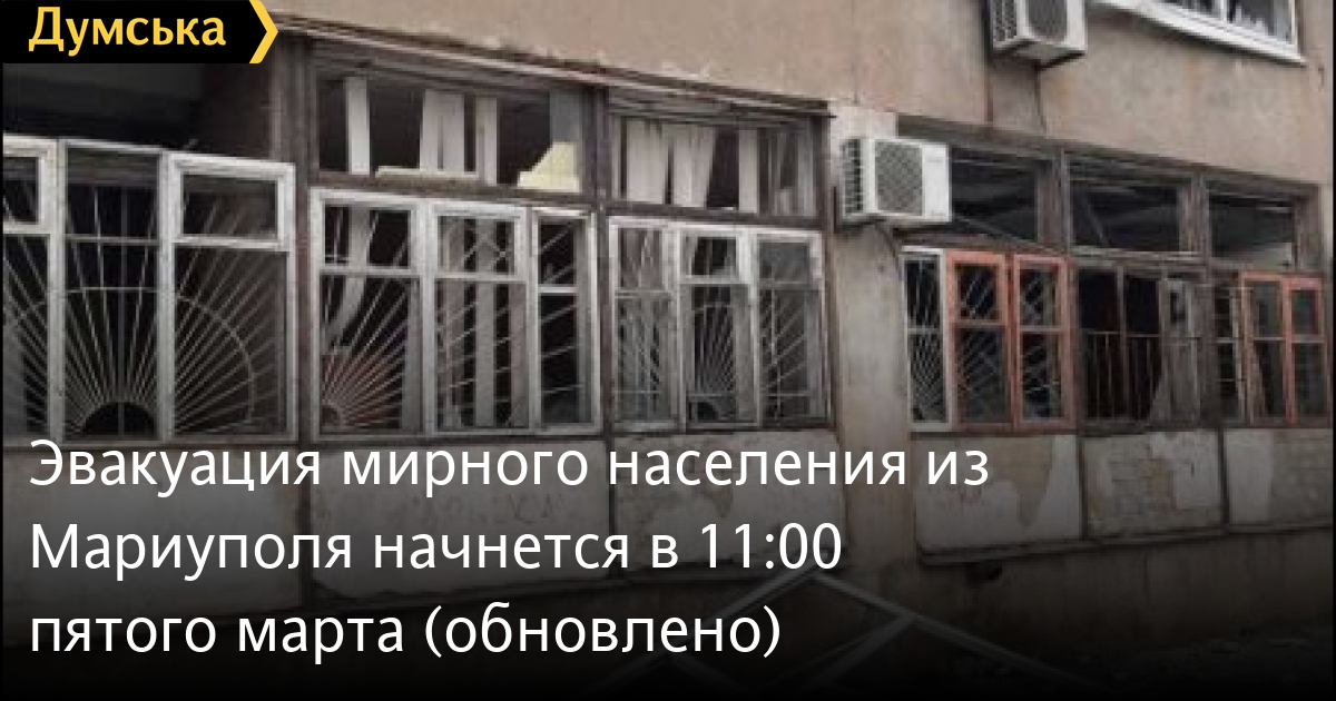 Эвакуация мирного населения из Мариуполя начнется в 11:00 пятого марта (обновлено)В Мариуполе начинается эвакуация мирного населения. Сегодня, 5 марта, с 9:00 до 16:00 будет установлен режим тишины. С 11:00 начинается эвакуация мирного населения. В качестве гуманитарного «зеленого» коридора выбран маршрут Мариуполь – Никольское – Розовка – Пологи – Орехов – Запорожье. Это информация Координационного центра под управлением руководителя Донецкой областной военно-гражданской администрации Павла Кириленко, сообщают в Мариупольском горсовете. Эвакуация населения будет происходить из трех локаций муниципальными автобусами: - СК «Ильичевец» (пр. Нахимова, 53) - Драматический театр (Театральная площадь, 1) - Кальмиусская районная администрация – (пр. Металлургов, 193) Также, следуя маршруту гуманитарного коридора в период тишины (с 9:00 до 16:00), можно будет выехать из города на личном транспорте. Огромная просьба ко всем водителям, выезжающим из города, максимально содействовать эвакуации мирного населения – берите с собой людей, заполняйте максимально транспорт. Отклоняться от маршрута гуманитарного коридора КАТЕГОРИЧЕСКИ ЗАПРЕЩАЕТСЯ. Всего будет несколько этапов эвакуации на протяжении нескольких дней для того, чтобы каждый желающий мог выехать. «Дорогие, родные мариупольцы, с сегодняшнего дня в городе начинается эвакуация мирного населения. Это непростое решение, но, как я всегда говорил, Мариуполь – это не улицы и дома. Мариуполь – это его жители, это мы с вами. И нашей главной задачей всегда было и остается защитить людей. В условиях, когда наш родной город постоянно находится под безжалостным огнем со стороны оккупантов, нет другого решения, как дать возможность жителям, то есть нам с вами, безопасно выехать из Мариуполя», — заявил городской голова Вадим Бойченко. ОБНОВЛЕНО В 12:48. Как сообщают в Мариупольском горсовете, эвакуация переносится в целях безопасности. Российская сторона не придерживается режима тишины и продолжила обстрелы как самого Мариуполя, так и его окрестностей. Всех мариупольцев просят расходиться и следовать в места укрытий. Дополнительная информация об эвакуации будет размещена в ближайшее время. СМЕРТЬ РОССИЙСКИМ ОККУПАНТАМ! Заметили ошибку? Выделяйте слова с ошибкой и нажимайте control-enter |