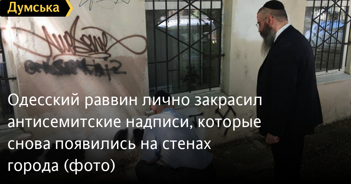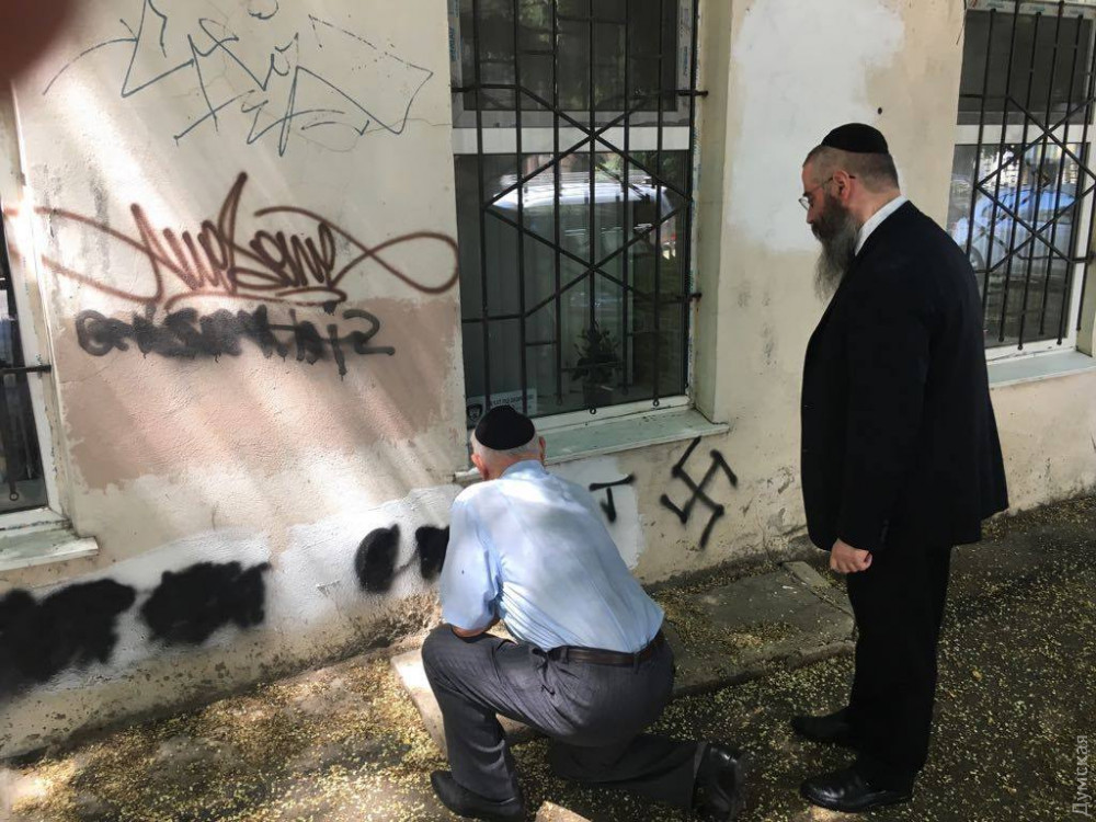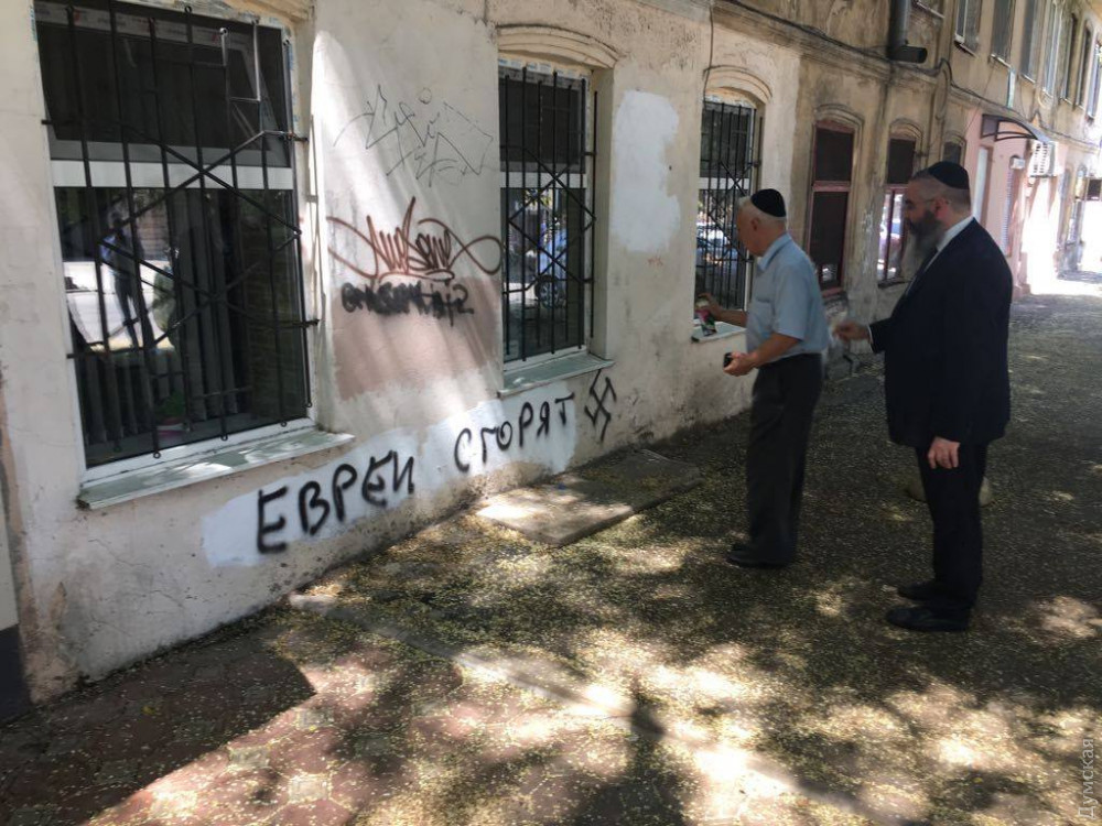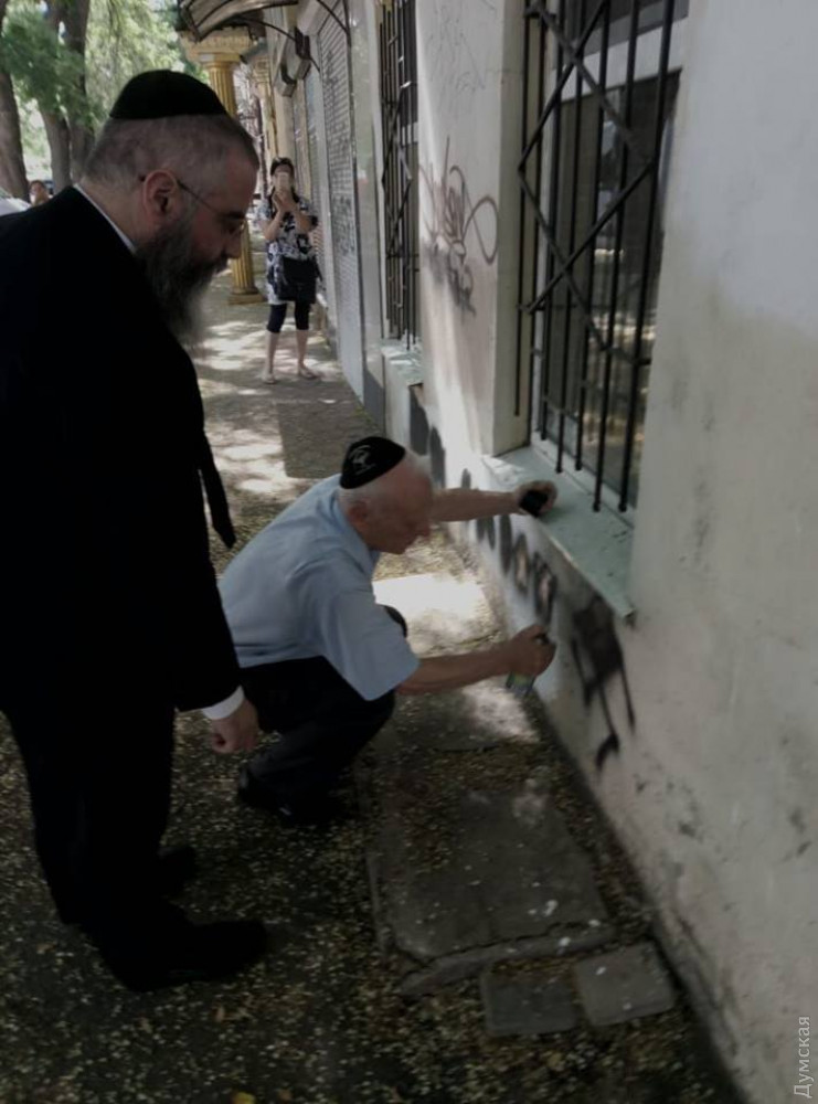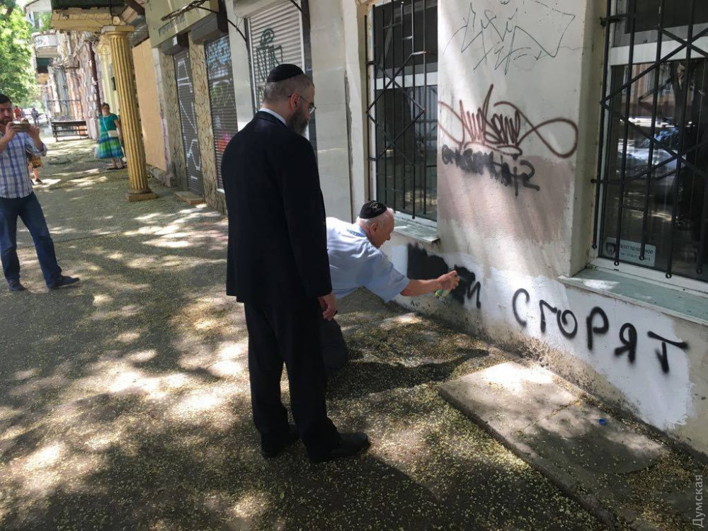 Главный раввин Одессы и Юга Украины Авраам Вольф и председатель Ассоциации бывших узников гетто Роман Шварцман закрасили антисемитские надписи, которые вновь появились на стенах Одессы.