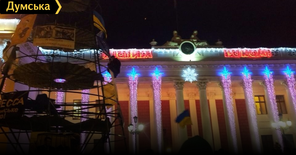 Но в Одессе картина другая. У нас на Думской евромайдановцы не живут. Да и мало их (многие в Киев поехали). Так почему праздник должен проходить исключительно под их флагами? Для многих людей символика ЕС не является праздничной и не имеет никакого отношения к Новому году.