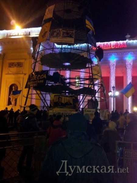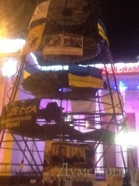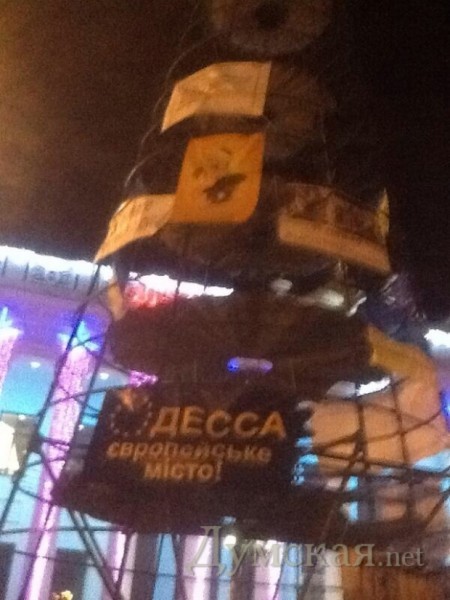 Участники одесского Евромайдана украсили каркас главной елки города флагами Украины и слоганами.
