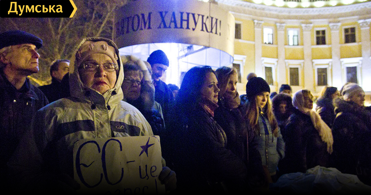 Очередной вечер одесского «Евромайдана» мало отличался от предыдущих: все те же выступления из-под памятника Ришелье Первому, все та же толпа сочувствующих с флагами ЕС и тематическими плакатами.