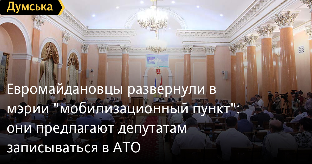 Попавшие в фойе здания горисполкома активисты «Евромайдана» развернули там импровизированный мобилизационный пункт и предлагают депутатам записываться добровольцами на войну.