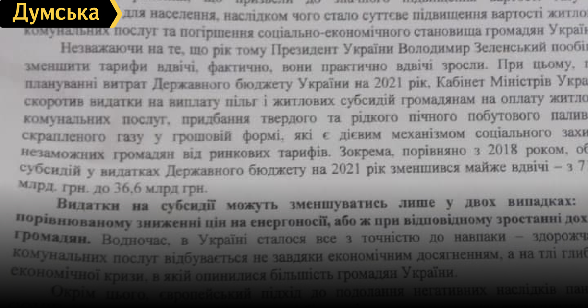 «Европейская Солидарность» инициирует «тарифные сессии» в местных советах Одесской области (политика)Партия «Европейская Солидарность» планирует вынести на рассмотрение депутатов ряда местных советов Одесской области проект решения об обращении к Верховной Раде, президенту и Кабинету министров об увеличении расходов на выплаты по льготам и субсидиям ЖКХ для населения в связи со значительным подорожанием газа и электроэнергии для населения в конце 2020 — начале 2021 года. Как сообщили в ЕС, вопрос о соответствующем обращении планируют внести в повестку дня ближайшей сессии Раздельнянского городского и районного советов. В Подольском городском совете планируют созвать для этого внеочередную сессию. Ранее, напомним, «Европейская Солидарность» инициировала созыв внеочередной сессии облсовета. Соответствующий документ глава фракции ЕС Михаил Шмушкович направил председателю собрания Григорию Диденко. Как отмечается в проекте решения, предложенного «Солидарностью», за последний год реальные доходы украинцев уменьшились, а если учесть продолжающееся падение экономики и пандемию коронавирусов, уменьшение доходов продолжится и в 2021 году. «Вместе с тем, в течение предыдущих недель были приняты решения о повышении цен на газ, тарифов на услуги распределения газа, тарифов на тепло, на электроэнергию, на холодную воду. Это создает угрозу для миллионов людей оказаться за чертой бедности. Украинцы, жители Одесской области, нуждаются в срочной защите», — говорится в проекте. По словам авторов, одним из эффективных механизмов защиты граждан от увеличения тарифов являются субсидии, которые помогают компенсировать расходы тем, у кого нет возможности платить за коммунальные услуги. Именно система субсидий сохраняет социальную справедливость и прозрачность бюджетных затрат, направляя средства на поддержку тех, кто действительно нуждается в помощи. «К сожалению, такой подход нарушен, поскольку средств в бюджете заложено мало, — констатируют в «Европейской Солидарности». — В госбюджете на 2021 год на выплату субсидий предусмотрено 36,6 млрд грн, что почти на 600 млн грн меньше, чем было в бюджете на 2020 год Это при том, что социально-экономическая ситуация в стране за последние годы не улучшилась. Следует отметить, что на 2019 год бюджетом на выплаты субсидий было предусмотрено 58,05 млрд грн. Кроме того, власть делает непонятные заявления относительно поставок электроэнергии и газа из страны-агрессора. Украина долгие годы не имела проблем с поставками электроэнергии и уже больше пяти лет не покупает газ в России. Наша энергетическая независимость от агрессивной империи является одним из главных достижений прошлого десятилетия. Любые разговоры о возврате этой газовой кабалы — это переход стратегически важной красной линии». Фракция ЕС предлагает коллегам обратиться к Верховной Раде с требованием немедленно пересмотреть тарифы для населения, а также пересмотреть Закон Украины «О Государственном бюджете Украины на 2021 год», увеличив расходы на выплату льгот и жилищных субсидий. «Средства предлагаем перераспределить из статей расходов, связанных с обеспечением Президента Украины, других высших органов государственной власти, правоохранительных органов», — добавляют депутаты. СМЕРТЬ РОСІЙСЬКИМ ОКУПАНТАМ! Помітили помилку? Виділ