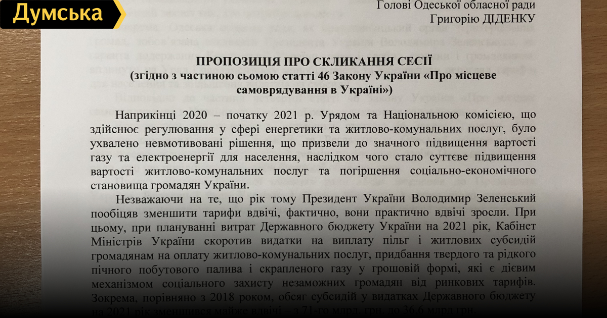 «Европейская солидарность» предлагает созвать внеочередную сессию Одесского облсовета — по тарифам (политика)Внеочередную сессию Одесского облсовета предлагает созвать депутатская фракция «Европейской солидарности». Соответствующий документ глава фракции Михаил Шмушкович направил председателю собрания Григорию Диденко. Фракция намерена вынести на рассмотрение сессии проект обращения к президенту Украины, Верховной Раде и Кабмину относительно пересмотра тарифов для населения и увеличения расходов на выплату льгот и жилищных субсидий. Как отмечается в тексте проекта, за последний год реальные доходы украинцев уменьшились, а если учесть продолжающееся падение экономики и пандемию коронавирусов, уменьшение доходов продолжится и в 2021 году. «Вместе с тем в течение предыдущих недель были приняты решения о повышении цен на газ, тарифов на услуги распределения газа, тарифов на тепло, на электроэнергию, на холодную воду. Это создает угрозу для миллионов людей оказаться за чертой бедности. Украинцы, жители Одесской области, нуждаются в срочной защите», — говорится в проекте. По словам авторов, одним из эффективных механизмов защиты граждан от увеличения тарифов являются субсидии, которые помогают компенсировать расходы тем, у кого нет возможности платить за коммунальные услуги. Именно система субсидий сохраняет социальную справедливость и прозрачность бюджетных затрат, направляя средства на поддержку тех, кто действительно нуждается в помощи. «К сожалению, такой подход нарушен, поскольку средств в бюджете заложено мало, — констатируют в «Европейской солидарности». — В госбюджете на 2021 год на выплату субсидий предусмотрено 36,6 млрд грн, что почти на 600 млн грн меньше, чем было в бюджете на 2020 год Это при том, что социально-экономическая ситуация в стране за последние годы не улучшилась. Следует отметить, что на 2019 год бюджетом на выплаты субсидий было предусмотрено 58,05 млрд грн. Кроме того, власть делает непонятные заявления относительно поставок электроэнергии и газа из страны-агрессора. Украина долгие годы не имела проблем с поставками электроэнергии и уже больше пяти лет не покупает газ в России. Наша энергетическая независимость от агрессивной империи является одним из главных достижений прошлого десятилетия. Любые разговоры о возврате этой газовой кабалы — это переход стратегически важной красной линии». Фракция ЕС предлагает коллегам обратиться к Верховной Раде с требованием немедленно пересмотреть тарифы для населения, а также пересмотреть Закон Украины «О Государственном бюджете Украины на 2021 год», увеличив расходы на выплату льгот и жилищных субсидий. «Средства предлагаем перераспределить из статей расходов, связанных с обеспечением Президента Украины, других высших органов государственной власти, правоохранительных органов», — добавляют депутаты. СМЕРТЬ РОСІЙСЬКИМ ОКУПАНТАМ! Помітили помилку? Виділяйте слова з помилкою та натискайте control-enter