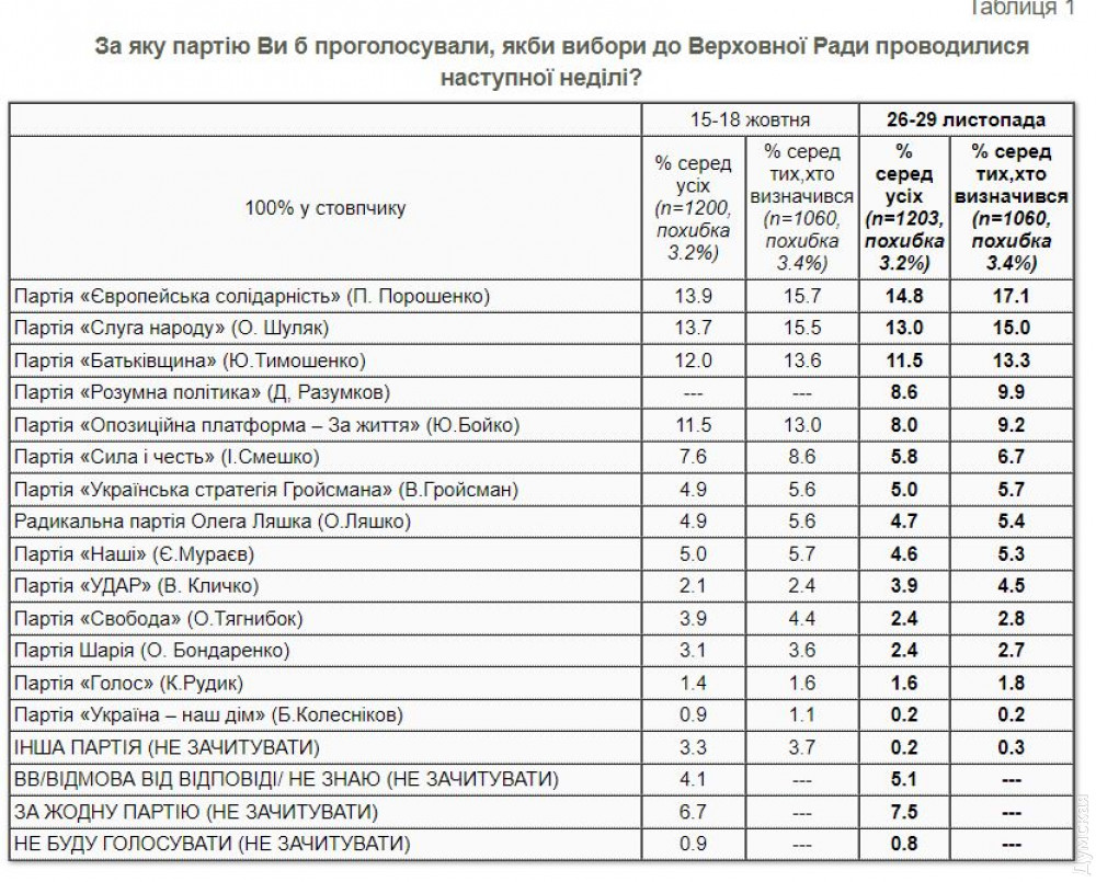 Так, по данным социологов, если бы выборы в Верховную Раду Украины проходили в следующее воскресенье, больше всего голосов получила бы партия «Европейская солидарность», за которую отдали бы свой голос 17,1% среди тех, кто определился с выбором (14,8% среди всех респондентов).