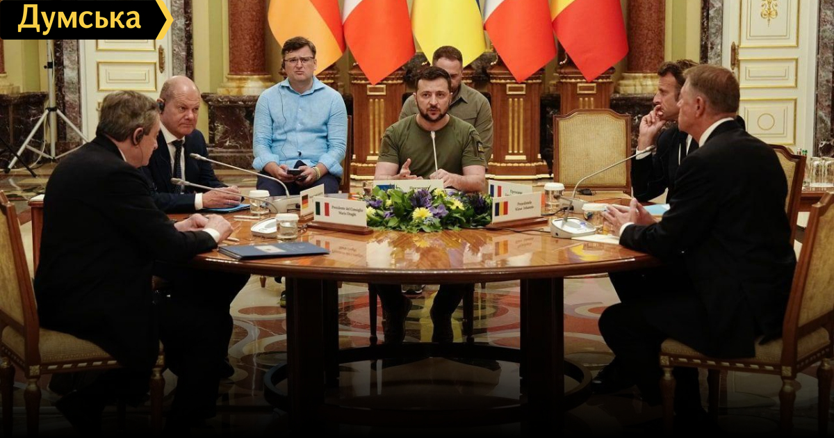 «Европейский десант» в Киеве: что привезли с собой лидеры ведущих стран ЕС и стоит ли Украине соглашаться с их предложением? (колонка главного редактора)Главная новость сегодняшнего дня — визит в Украину лидеров сразу четырех государств: президента Франции Эмманюэля Макрона, канцлера Германии Олафа Шольца, премьер-министра Италии Марио Драги и президента Румынии Клауса Йоханниса. Они побывали в освобожденном от российских нацистов Ирпене, где ознакомились с многочисленными свидетельствами военных преступлений, совершенных оккупантами. Сделали несколько заявлений, суть которых сводится к тому, что западные страны по-прежнему едины в своем стремлении помогать Украине, ужасаются варварству россиян и восхищаются мужеством нашего народа. Еще гости высказались в поддержку предоставления Украине статуса кандидата в члены ЕС (что, кстати, ничего не значит, поскольку кандидатом можно быть десятилетиями — как, скажем, все еще ждет полноценного членства Турция). После этого они провели встречу с украинским президентом. Беседа проходила за закрытыми дверями. Руководитель офиса главы государства Андрей Ермак рассказал журналистам, что в ходе встречи Зеленский передал коллегам пакет украинских санкционных предложений. Также известно, что стороны обсудили вопросы снятия морской блокады и послевоенного восстановления Украины. Однако главным, как мне кажется (и не только мне), было не это. Главной темой встречи наверняка было возобновления диалога с Москвой. Собственно, то, что она как минимум присутствовала в повестке дня, публично заявляют сами участники беседы. Скажем, Эмманюэль Макрон: «Мы всегда поддерживаем вариант диалога, потому что в один прекрасный день конфликт должен прекратиться и должны начаться переговоры. Но условия переговоров должны быть определены Украиной: Франция и Германия никогда не будут посредниками за спиной Украины и никогда не будут выставлять Украине условий», — сказал французский лидер, добавив, что Франция и Германия могут участвовать в этом процессе как гаранты безопасности нашей страны. Тем не менее наблюдатели полагают, что условия все же есть, точнее предложение и европейцы увязали этот вопрос (переговоров со страной-агрессором) с перспективами членства Украины в ЕС. Иными словами, хотите в Европу — договаривайтесь с путиным. Если гости, действительно, приехали с таким предложением, то это объясняет состав сегодняшнего «европейского десанта». Во-первых, Франция, Германия и Италия («большая европейская тройка») никогда особо не скрывали, что выступают именно за политическое решение — хотя бы временное. Именно из столиц этих ключевых европейских государств неоднократно звучали призывы «дать путину возможность сохранить лицо», «не загонять его в угол», а Италия даже разработала мирный план, который предполагает целый ряд уступок со стороны Украины. А еще они уже не скрывают, что договорились между собой не поставлять нам определенные виды вооружения — танки или самолеты. Чтобы, значит, не злить российского диктатора (очень дурно пахнущие договоренности на фоне открытых переговоров в Рамштайне). И одновременно эти страны с самого начала полномасштабной агрессии довольно благосклонно смотрели на евроустремления Киева — в отличие от Нидерландов или Венгрии. Поддастся ли Зеленский на у