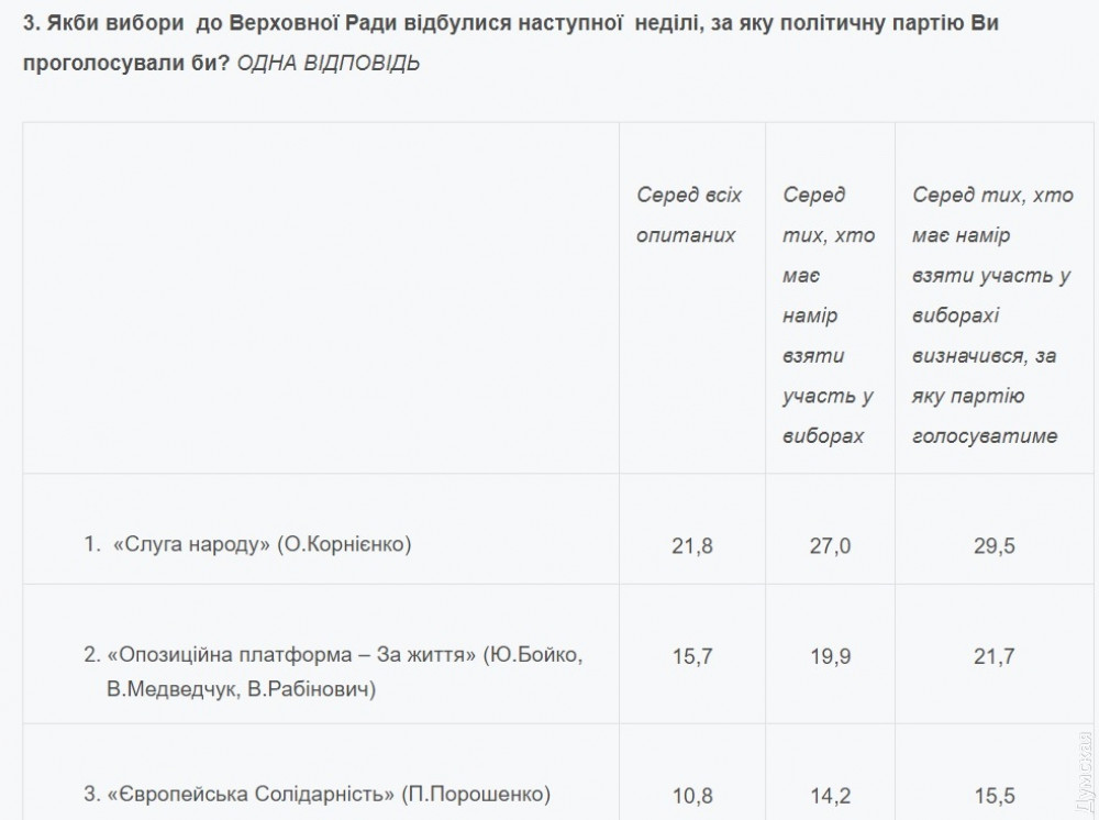 Возросло количество сторонников ОПЗЖ — сегодня за нее готовы проголосовать почти 22% избирателей. На третьем месте «Европейская Солидарность» — чуть меньше 16%.