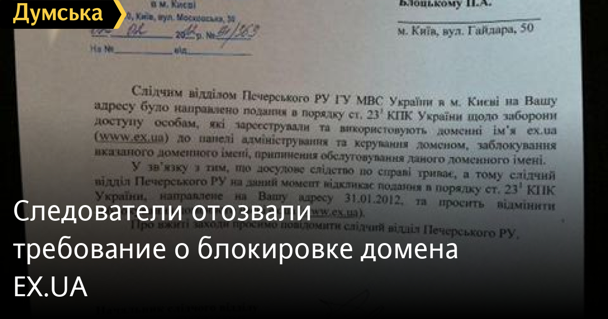 Следствие отозвало требование о блокировании домена ex.ua, согласно которому позавчера регистратор Imena.ua прекратил обслуживание домена, в результате чего файлообменный ресурс стал недоступен. Об этом рассказал управляющий партнер юридической фирмы «Юскутум» Артем Афян, который представляет интересы EX.UA, пишет «Фокус».