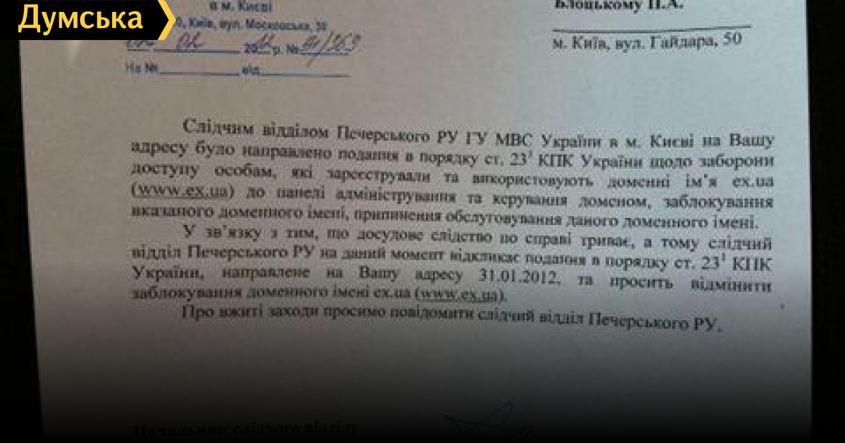 Следствие отозвало требование о блокировании домена ex.ua, согласно которому позавчера регистратор Imena.ua прекратил обслуживание домена, в результате чего файлообменный ресурс стал недоступен. Об этом рассказал управляющий партнер юридической фирмы «Юскутум» Артем Афян, который представляет интересы EX.UA, пишет «Фокус». Он также рассказал, что дело было возбуждено по факту размещения на портале пятью неустановленными лицами контрафактной продукции компании Adobe. Сумму ущерба истец оценил в 180 тыс. грн. «Следствие разобралось, что факт размещения на портале нелицензионных продуктов не может стать причиной для блокирования домена, поэтому требование было отозвано. Теперь домен снова может быть включен, однако, сервера портала все еще у милиции. Их изъятие никак не способствует установлению личностей пяти человек, которые разместили контрафактный контент. Более того, после блокирования домена установить личности нарушителей стало невозможно», — рассказал Афян. Сервера были изъяты под предлогом того, что на них могут быть копии продуктов Adobe, размещенных нарушителями.