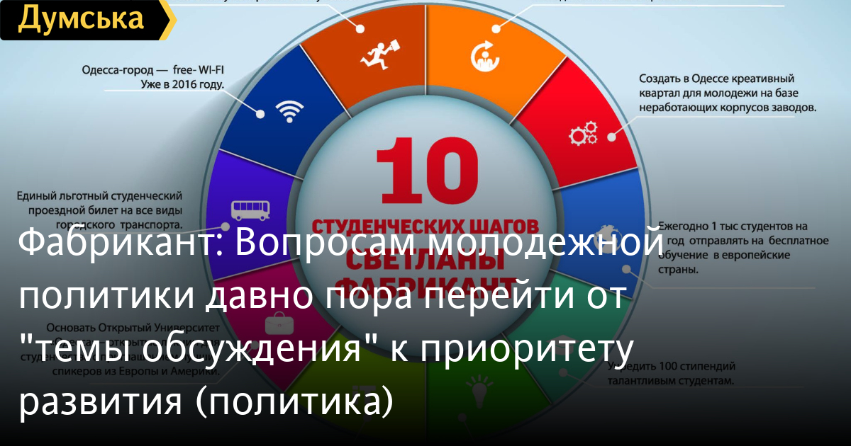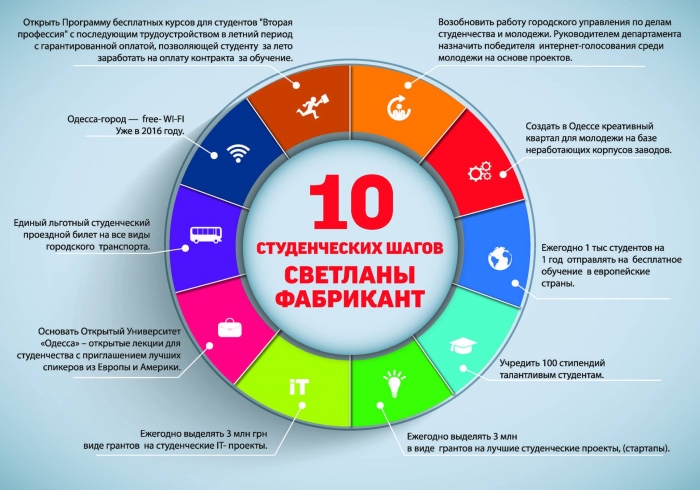 Ни один из кандидатов на пост городского головы не посчитал нужным уделить внимание не только острым моментам городского хозяйства — ЖКХ, социальная сфера, транспорт, но и такому стратегически важному для любого общества аспекту, как молодежная и семейная политика. И здесь команда партии «Відродження» демонстрирует самые серьезные намерения и подходы. В «Программе действий» Светланы Фабрикант подробно прописаны «10 студенческих шагов», направленных в первую очередь на поддержку молодого поколения.