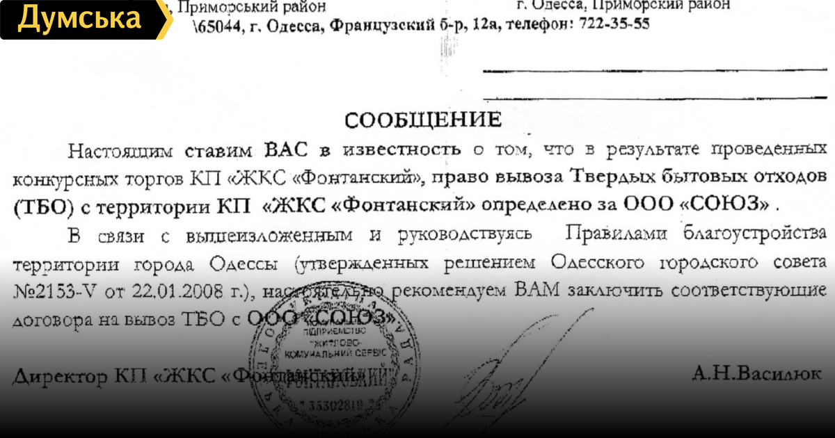 Власти настоятельно рекомендуют предпринимателям заключать договоры с фирмой «Союз»Недавно в адрес предпринимателей, которые работают на территории ЖКС «Фонтанский», массово стали приходить письма, где директор указанного ЖКCа, опираясь на результаты январского тендера, «настоятельно рекомендует» им заключить договоры на вывоз мусора с фирмой «Союз». Напомним, что компания «Экоград» заключила пятилетний договор на вывоз мусора с ЖКС «Фонтанский» в феврале 2010 года. Однако в январе 2011-го, когда тендер на вывоз ТБО с указанной территории выиграла компания «Союз», ЖКС потребовал расторгнуть договор с «Экоградом», в чем отказал затем как суд первой инстанции, так и апелляционный. Таким образом сейчас территорию «Фонтанского» украшают мусорные баки сразу двух компаний — «Экограда», имеющего законное право на вывоз ТБО с этой территории еще в течение без малого четырех лет, и «Союза», выигравшего тендер. Вместе с тем, за выполненную работу город платит лишь фирме Игоря Маркова. По мнению предпринимателей, такие «рекомендации» не могут иметь под собой законных оснований, и являются средством психологического давления городской власти на частников. СМЕРТЬ РОСІЙСЬКИМ ОКУПАНТАМ! Помітили помилку? Виділяйте слова з помилкою та натискайте control-enter