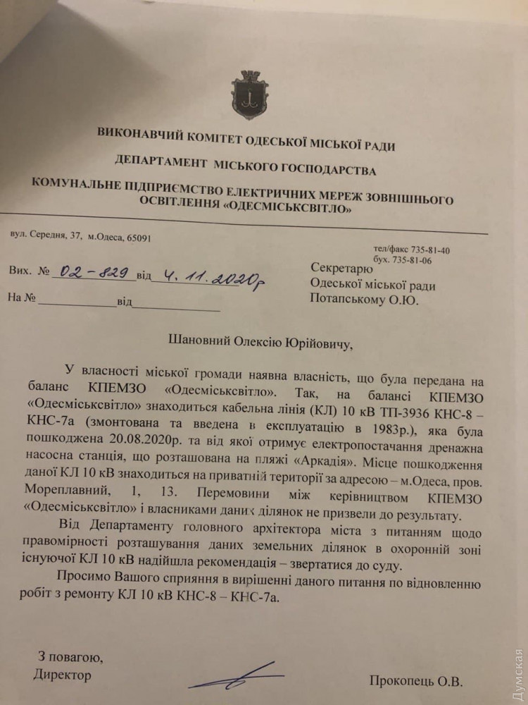 20 августа 2020 года сотрудники КП «Одесгорсвет» зафиксировали потерю электропитания в кабельной линии, которая снабжает канализационную насосную станцию, расположенную в Аркадии. Обесточивание объекта означает слив фекальных масс в море и экологическую катастрофу. Этого не произошло, поскольку имеется еще одна, резервная, линия питания, однако, к сожалению, коммунальщики до сих пор не устранили повреждение.