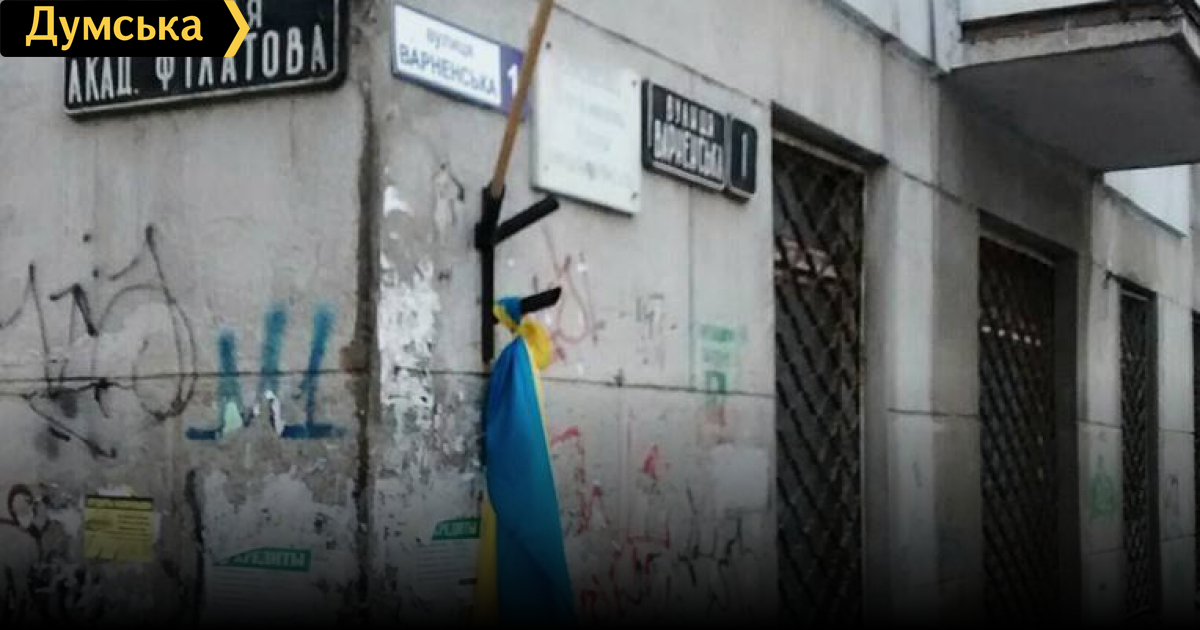 На одном из жилых домов по улице Варненская государственный флаг Украины привязали, как тряпку.