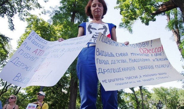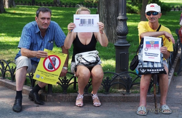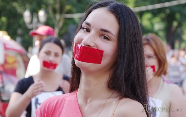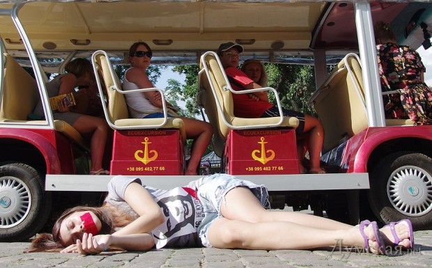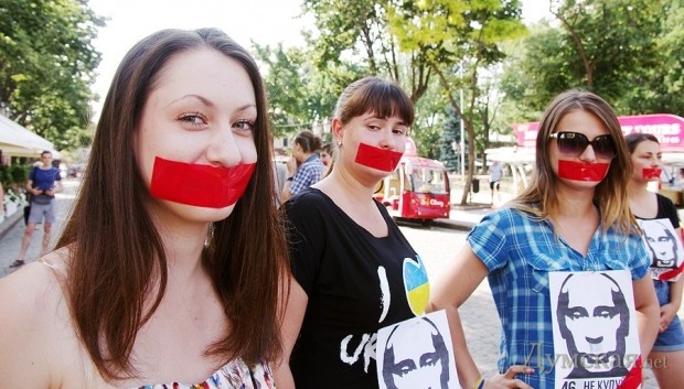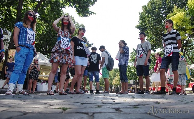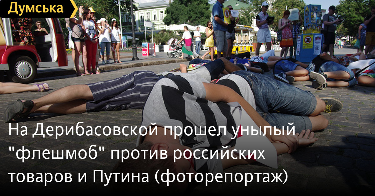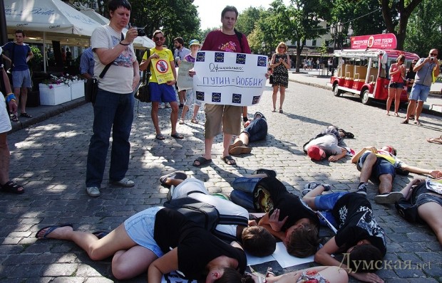Одесский «Евромайдан» отметился очередной бестолковой акцией: молодые люди в количестве 25-ти человек, с заклеенными скотчем ртами и портретами Путина на груди, по свистку пять минут полежали на брусчатке посреди Дерибасовской.