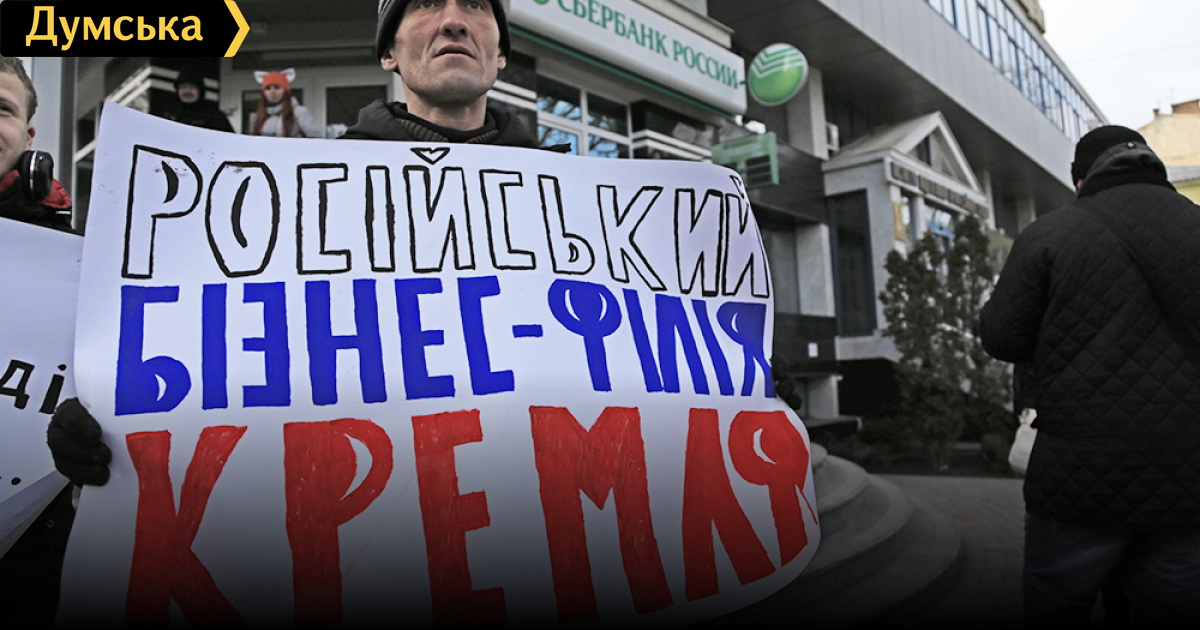 Всего активистов было человек 30. Они держали в руках плакаты с надписями «Не покупай российское», «Сбербанк убивает» и «Российский бизнес — филиал Кремля».