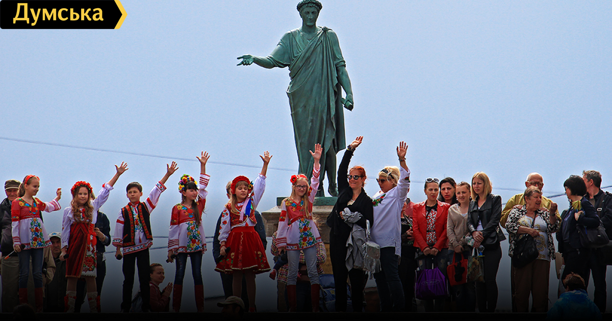 Сегодня возле памятника Дюку юные патриоты устроили акцию, посвященную национальному костюму украинцев — вышитой сорочке.