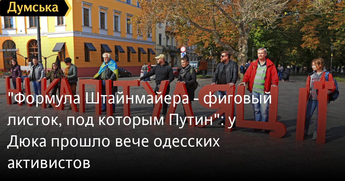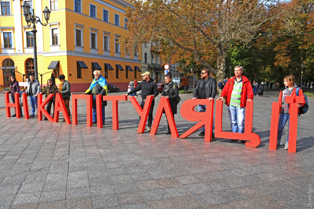 Более пяти сотен активных одесситов с украинскими флагами и плакатами пришли продемонстрировать свою позицию. Перед началом акции собравшиеся свободно общались, спорили, но все были едины во мнении, что эта формула приведет нашу страну к капитуляции. Активисты в шутку называли документ «формулой шахер-махера», намекая на то, что украинцев обманули.