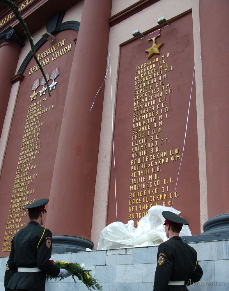 Сегодня на одесской Стене Героев, что напротив Оперы, появились новые имена. Увековечены три Героя Советского Союза – Николай Гурский, Петр Гусаков и Николай Макридов, — а также три Героя Социалистического труда – Зинаида Соломатина, Борис Зайцев и Надежда Терземан. Гурский Николай Васильевич (1913-1983) — лейтенант понтонно-мостового батальона. Отличился во время форсирования Днепра. 29 сентября 1943 года, когда в районе острова Глинск-Бородаевский затонул шестнадцатитонный паром, Гурский, ныряя на глубину трех метров, снял с него моторы, после чего установил их на другие паромы, способствовав успешной переправе советских частей. Звание Героя присвоено 20 декабря 1943-го. После войны Николай Васильевич преподавал Одесского высшего инженерно-морского училища (ныне морская академия). Гусаков Петр Евтихиевич (1920-1995) – уроженец Ставропольского края. В РККА – с 1940-го года. Участник Великой Отечественной с самого первого дня. Как и Гурский, отличился во время битвы за Днепр. 24 сентября 1943 года Петр Гусаков одним из первых переправился через Днепр в районе села Григоровка Каневского района Черкасской области. На западном берегу десант захватил плацдарм и окопался на нём. Немецкие войска предприняли против советских подразделений ряд контратак. В бою Гусаков заменил собой погибшего пулеметчика, а когда противник прорвался к позициям обороняющихся, принял участие в рукопашной схватке. Десант отбил четыре немецких контратаки, способствовав успешной переправе через Днепр советских пехотных и танковых подразделений. За этот подвиг 10 января 1944 года был удостоен звания Героя. После войны служил во внутренних, а потом — в пограничных войсках. Макридов Николай Афанасьевич (1920-1994) — комсорг 493-го стрелкового полка 159-й стрелковой дивизии 5-й армии 3-го Белорусского фронта. В середине июля 1944 года успешно форсировал реку Неман северо-западнее Каунаса (Литовская ССР), участвовал в отражении многочисленных контратак врага. 17 августа одним из первых в дивизии вышел на государственную границу с Восточной Пруссией в районе не города Кудиркос-Науместис. Звание Героя Советского Союза присвоено 24 марта 1945 года. Соломатина Зинаида Федоровна (родилась в 1921 году) — советский военный и гражданский лётчик, Герой Социалистического Труда. В годы Великой Отечественной войны совершила 96 боевых вылетов на самолете Як. Прикрывала охраняемые объекты, передвижения войск, сопровождала транспортную авиацию. Провела несколько боев с самолетами противника в небе Сталинграда и Украины. За отличное выполнение боевых заданий имела ряд благодарностей, награждена орденом Отечественной войны II степени. После демобилизации из армии Соломатина перешла на работу в Гражданский воздушный флот. Сначала на легких самолетах перевозила больных, доставляла консервированную кровь и медикаменты. Затем, окончив Школу высшей летной подготовки, стала водить тяжелые двухмоторные воздушные корабли. Звания Героя Соцтруда удостоена в 1960 году. Зайцев Борис Петрович – Народный артист Украины, Герой Социалистического труда. Родился 1 августа 1925 года. В 16 лет добровольцем ушел на фронт. С боями прошагал от Москвы до Кенигсберга. Был разведчиком и связистом. В самом конце войны, в одном из боев под Кенигсбергом, выполняя боевое задание, Зайцев подорвался на мине. Принесли его еле живого, б