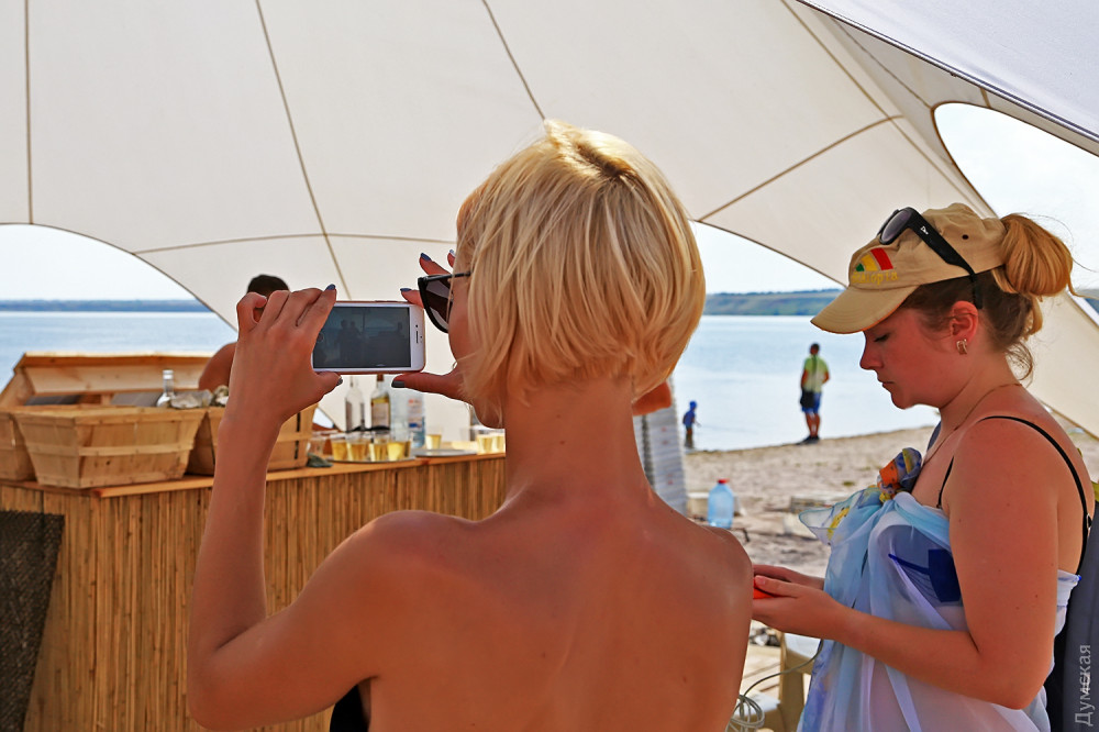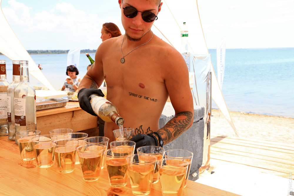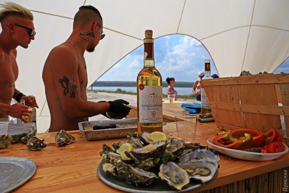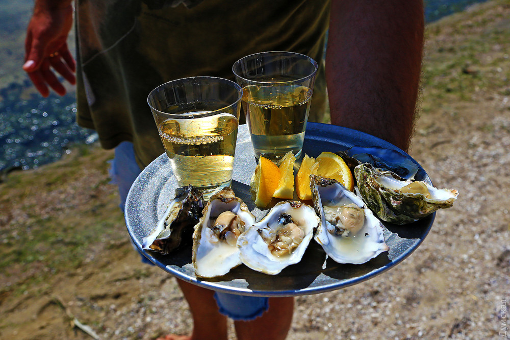 Шатер разбит над большим дощатым настилом, на котором стоит несколько столиков. Стильные парни с татуировками ловко орудуют специальными ножами, открывая устрицы, и разливают по бокалам сухое шардоне. Рядом, на мелководье, сквозь чистую лиманскую воду можно разглядеть ящики с моллюсками. Сама ферма находится, конечно, не здесь, но экскурсант должен видеть, как примерно она выглядит.