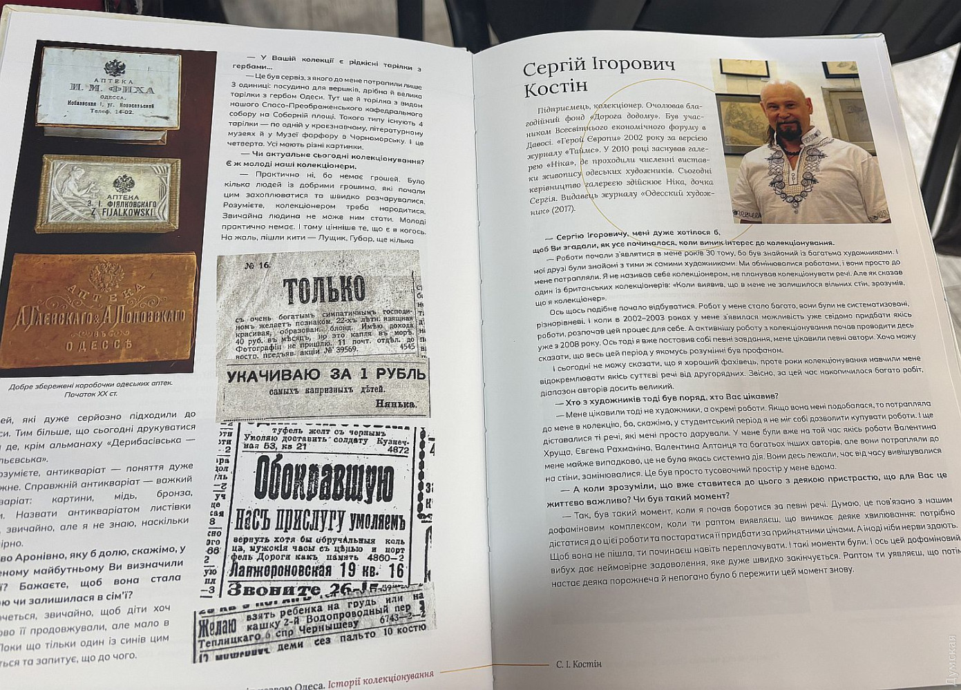 Анна Голубовська фотограф, дослідниця, викладачка історії мистецтва та фотографії, авторка статей про фотографію XIX століття та пострадянських країн. Її батько, відомий журналіст Євген Голубовський, колекціонував живопис, англійські настінні тарілки та рідкісні книги. «У мене є невелика колекція старовинних фотографій, розповідає Анна. Купую дуже вибірково, найчастіше фотографії, про які пишу. Те, що відгукується в серці, не просто імя автора, а знімок, який, побачивши, не можу випустити з рук, або роботи авторів, які мене цікавлять професійно, і це рідкість». Іноді вона знаходить цікаві речі й на Староконному ринку. «Ось уявіть собі скарб сотня коробочок зі скляними фотопластинами, безліч обрізків плівки з негативами. Зараз пишу книгу про новатора у фотографії Йосипа Карла Мігурського. Будучи юнаком, він написав підручник з фотографії, який і сьогодні актуальний. Видання вийшло в 1859 році, через 20 років після винаходу фотографії. Блискучий автор, сміливий експериментатор і гідна людина, життя якої було сповнене злетів і падінь. Їздив репортером на війну, був там поранений, знімав ще в 1870-х живі вуличні репортажі, дивом не потрапив до в'язниці в 1871-му за підтримку євреїв під час погрому. Але хоча влада не посадила, то ті, хто громив, помстившись, спалили фотомайстерню», ділиться Анна. 8. ЄВГЕН ДЕМЕНОК — ПИСЬМЕННИК, ЯКИЙ ЗБИРАЄ ХУДОЖНИКІВ Письменник і дослідник Євген Деменок збирає роботи одеських художників різних епох. «У старших класах моїм головним захопленням було малювання, зізнається Євген. Я не тільки малював, а й зачитувався біографіями художників, мріяв незабаром стати одним із них, обходив вздовж і впоперек одеські музеї, збирав альбоми та каталоги». У підсумку мрія трансформувалася він став дослідником і колекціонером. «Мій приятель по заняттях йогою Дмитро Банніков уже організовував виставки. Першими були акварелі чудового художника Андрія Герасимюка. А на відкритті МСІО я виставив кілька літографій Далі, які купив у Брюгге. Банніков став моїм провідником, через нього я познайомився з усіма, кого вважав цікавими. У моїй колекції є роботи одеських художників за 100 з гаком років: починаючи від Костанді й закінчуючи Ройтбурдом та Гусєвим». 7. ОЛЕКСАНДР ДМИТРЕНКО: ВІД МОНЕТ ДО «ПЛАСТИКОВОГО РАЮ» Науковий співробітник Одеського художнього музею Олександр Дмитренко зараз служить у ЗСУ та проходить реабілітацію після важкого поранення. Він спеціалізується на біографічних дослідженнях художників і колекціонерів. У дитинстві колекціонував значки геральдичного напрямку, а також машинки в масштабі 1:43. Коли подорослішав, почав колекціонувати монети, вивчав першоджерела, звертався до архівів, щоб зясувати, на якому монетному дворі, якими пуансонами, технікою, інструментами тощо це робили. Далі склалася колекція автопортретів, які можна знайти у кожного художника в майстерні, але зазвичай їх не купують. Виставка цієї колекції відбулася у 2011 році в Музеї західного та східного мистецтва, на її відкриття прийшло понад тисячу людей. Після автопортретів у Дмитренко зявилося захоплення одеською настільною медаллю, потім були пластикові статуетки з клеймом Одеського художнього виробничого комбінату. «Це декоративно-прикладне мистецтво територіального характеру. Речі призначені лише для прикраси оселі, тобто суто інтерєрні. П
