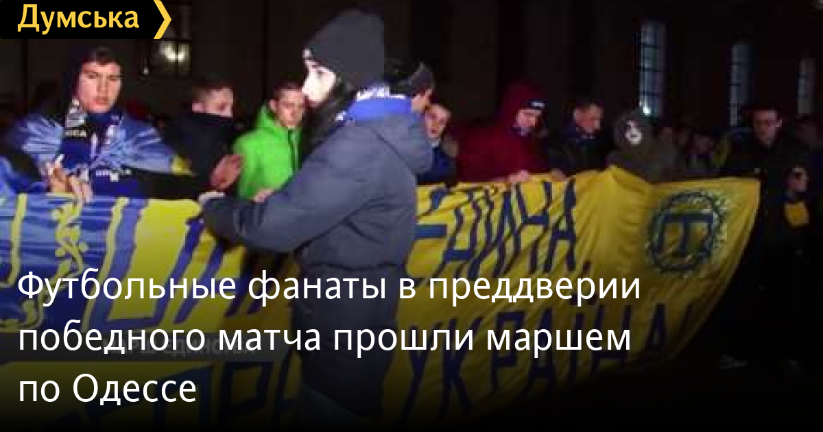 Знаменосцы и барабанщики. В субботу в преддверии футбольного матча Украина-Финляндия фанаты со всей страны прошлись маршем по центру Одессы. В акции приняли участие более пятисот человек. СМЕРТЬ РОССИЙСКИМ ОККУПАНТАМ! Заметили ошибку? Выделяйте слова с ошибкой и нажимайте control-enter Думская ТВ. Сюжеты: