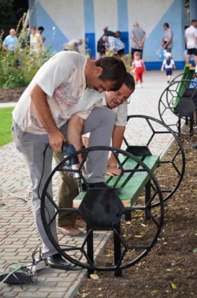Кроме того, завершились работы по укладке тротуарной плитки и обустройству газонов. Вдоль сквера, согласно задумке авторов, была возведена тематическая декоративная ограда, отделяющая его от проезжей части. На территории сквера вдоль дорожек установлено около тридцати скамеек, оформленных в едином стиле с оградой. Также в центре футбольного парка установлена беседка с куполом в виде футбольного мяча и такие же тематические фонари.