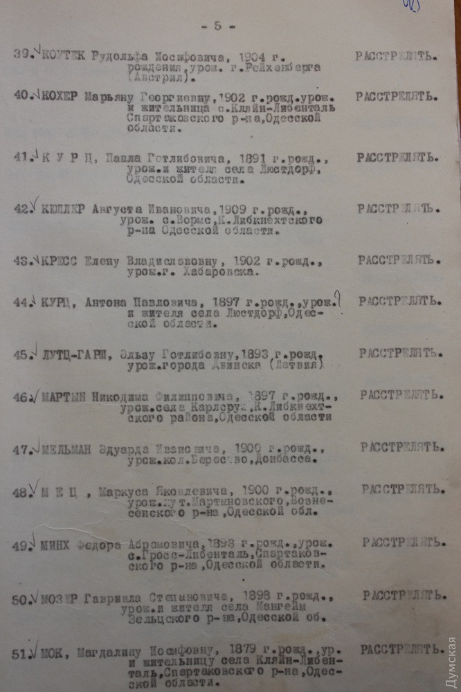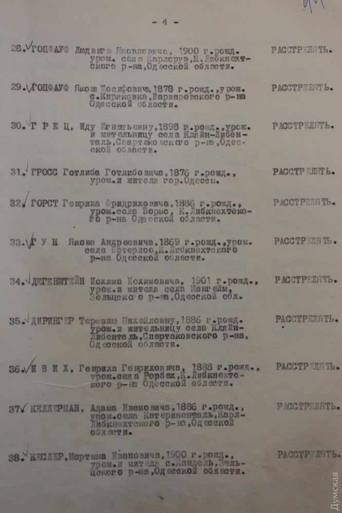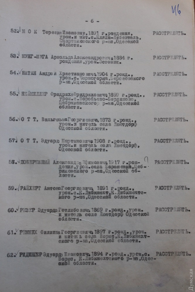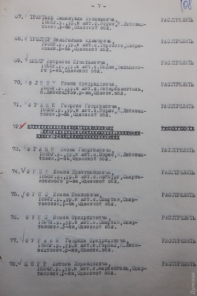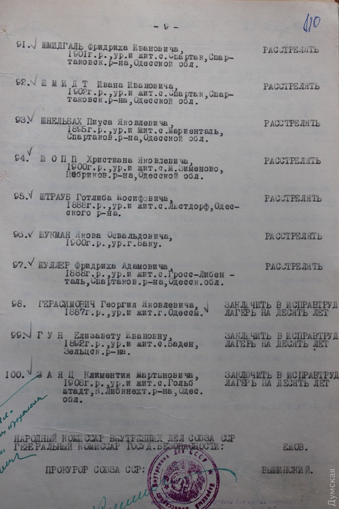 Вот, скажем, протокол К-47 от 17 ноября 1937 года. Лаконичный до невозможности. Присутствовали: народный комиссар внутренних дел генеральный комиссар государственной безопасности Ежов, прокурор Союза ССР Вышинский. Слушали: материалы по обвиняемым, предоставленные управлением НКВД УССР по Одесской области, в порядке приказа НКВД -00439 от 25 июля 1937 года. Далее слово «постановили», под которым ровно сто имен, почти все немецкие. Возле 97 – «расстрелять», троим определено в качестве кары десять лет лагерей. В расстрельном списке много людей с одинаковыми фамилиями — похоже, это близкие родственники. Есть братья, отцы и сыновья. В основном 30-40-летние мужчины. Места проживания: Мариенталь, Иоганнесталь, Люстдорф, Мангейм, Вормс, Гросс-Либенталь, Зельц, Воробьево-Берлин, Катериненталь, Ватерлоо, Нейбург и так далее. Это все Одесская область, если что.