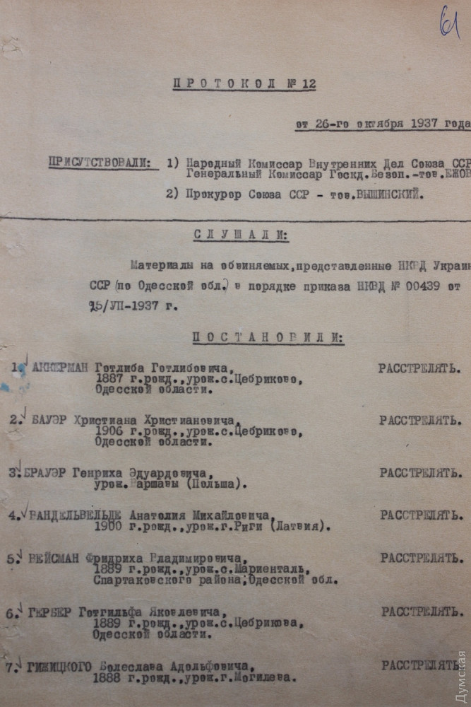 И таких, «немецких», протоколов великое множество. Где-то указано больше народу, где-то меньше, но всегда речь идет о десятках человек. В этом же фонде можно найти приказы об «исполнении»: начальник одесского областного УНКВД (они менялись после расстрела очередного) предавали приговоренных Ежовым и Вышинским в руки известного нашим читателям товарища Лелеткина, который до 14 марта 1938 года занимал должность коменданта управления. После «исполнения» тот обязательно отчитывался – эти документы тоже есть в архиве. Отчет о казни, как правило, является последним документом, в котором упоминался казненный…