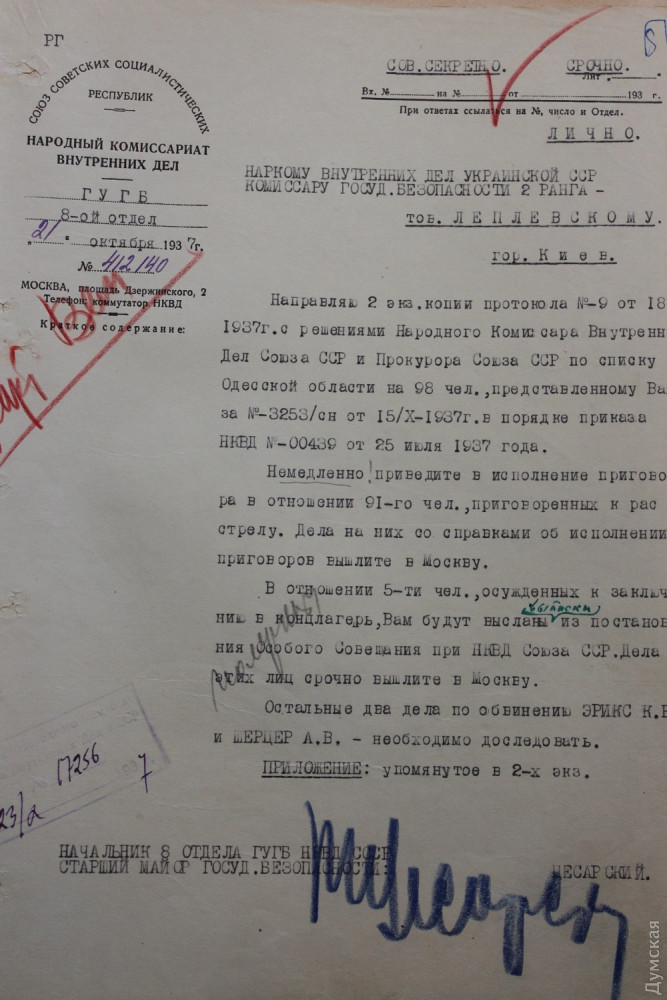 Он информирует шефа, что в архивном деле, хранящемся в управлении, есть копия письма от 12 апреля 1933 года на имя начальника учетно-статистического отдела ГПУ УССР за подписью заместителя начальника одесского областного отдела этого карательного ведомства. Там, в частности, говорится, что «за отсутствием специально оборудованного помещения при облотделе ГПУ приговоры над осужденными к расстрелу приводятся в исполнение на непользуемых кладбищах, расположенных в трех и больше километрах от города с сохранением необходимой конспирации». В этом же письме автор просит о выделении средств для строительства соответствующего помещения, в котором могли бы исполняться «приговоры» над такими людьми.