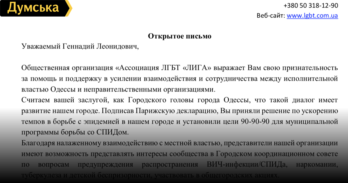 Ассоциация ЛГБТ «Лига» подтвердила «Думской», что написала письмо в поддержку мэра Одессы Геннадия Труханова, о чем сегодня на заседании Соломенского райсуда столицы говорил адвокат городского головы. «Уважаемый Геннадий Леонидович, общественная организация «Ассоциация ЛГБТ «ЛИГА» выражает Вам свою признательность за помощь и поддержку в усилении взаимодействия и сотрудничества между исполнительной властью Одессы и неправительственными организациями, — говорится в документе. — Считаем вашей заслугой, как Городского головы города Одессы, что такой диалог имеет развитие в нашем городе. Подписав Парижскую декларацию, Вы приняли решение по ускорению темпов в борьбе с эпидемией в нашем городе и установили цели 90-90-90 для муниципальной программы борьбы со СПИДом. Благодаря налаженному взаимодействию с местной властью, представители нашей организации имеют возможность представлять интересы сообщества в Городском координационном совете по вопросам предупреждения распространения ВИЧ-инфекции/СПИДа, наркомании, туберкулеза и детской беспризорности, участвовать в общегородских акциях. Мы имеем возможность влиять на политику в области общественного здравоохранения, обсуждать проблемы и пути решения, которые есть у сообщества ЛГБТ Одессы. Еще раз выражаем вам свою поддержку и рассчитываем на дальнейшее сотрудничество». КТО ЕЩЕ ПОДДЕРЖАЛ ТРУХАНОВА. Полный список всех организаций, направивших письма в поддержку мэра Одессы: Міжнародний фестиваль «Одеса Джаз» Українська асоціація споживачів Одеси Благодійна організація «Сонячні діти» ГО «Особливі Діти» ГО «Здорове суспільство» Громадська організація Іллі Муромця ГО «Українська Спілка ветеранів Афганістану (воїнів-інтернаціоналістів) ГО «Вперед до Мети» ГО «Демократична молодь України» ГО «Інваліди Надії В Майбутнє» ГО «Асоціація Одеських будівельників» ВО «Велика Родина» МГО«Фонд Злата Лада» Українське товариство «Степи» Громадсько-благодійна організація «Сонячні діти» Офіцери та ветерани збройних сил Організація ветеранів міста Одеси ГО «Шлях до Свободи» ВГО «Союз Чорнобиль України» ГО «Надія» Благодійний фонд святого Пантелеймона цілителя Благодійна організація «Дитячий світ» Всеукраїнська асоціація працездатних інвалідів Спілка сприяння військовослужбовцям та ветеранам міста Одеси ГО «Молодь Інваліди» ГО «Спілка архитекторів України» ГО «Спілка архитекторів України». Одеська обласна организація ГО «Право Вибору» Асоціація ЛГБТ «Ліга» Одеська міска рада багатодітних сімей ГО «Центр захисту прав та інтересів громадян міста Одеси» ГО «Пересіпчанка» Благодійна організація «Сім'я» БФ» Фонд Відродження та Єдність» ГО «Сак против» ВБФ «Деполь Україна» Рада багатодітних сімей «Україна велика родина» Дитячо-юнацький футбольний клуб «Атлетік» ГО «Медична правда» Товариство інвалідів Суворовского району Одеси Спортивний клуб інвалідів 'Одеса-Баскет ' Благодійний фонд «Планета добрих людей» Громадский рух «Віра, надія, любов» Благодійна організація «Добрий початок» ГО «Одеське міське товариство інвалідів» ГО «12 кроків» Південноукраїнський регіональний центр молодих інвалідів Благодійна організація «100% життя» ГО «Рівноправне суспільство» БФ «Сімейний доктор» ГО «Одеське міське добровільне товариство» ГО «Паруса надії» Союз ветеранів п