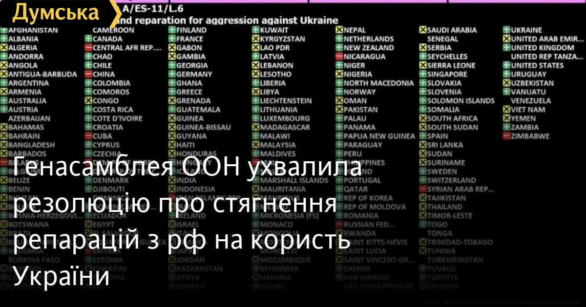 Резолюцію, в якій росія визнається відповідальною за виплату репарацій Україні, ухвалила Генасамблея ООН 14 листопада.