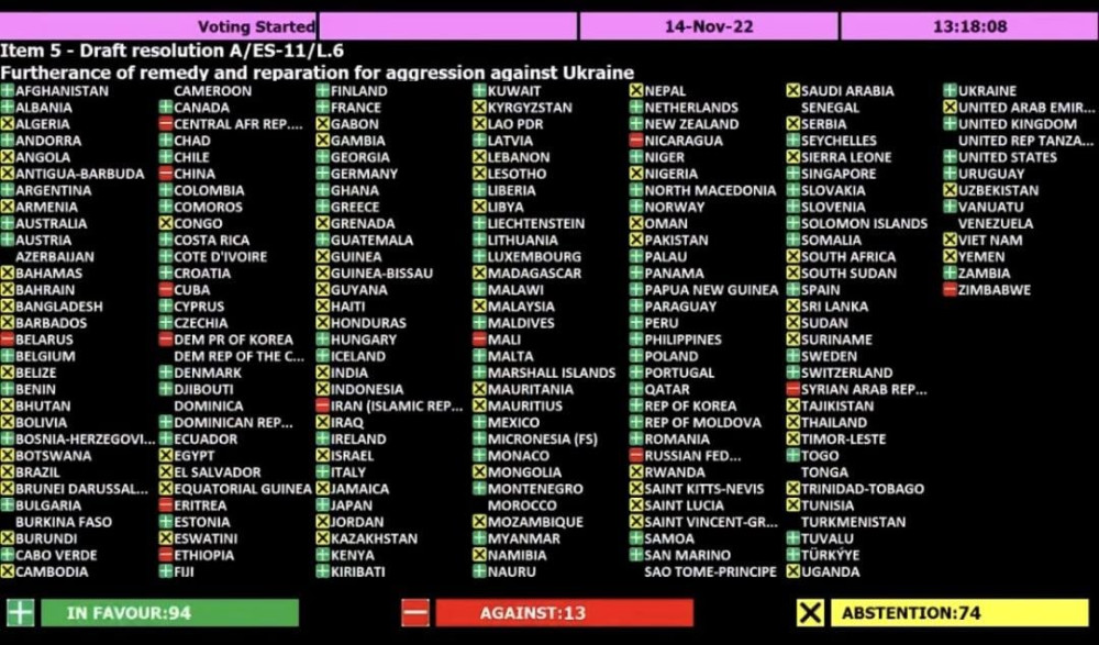 Документ підтримали 94 країни. Ще 73 держави утрималися. При цьому 13 країн не підтримали резолюцію. Серед них: Білорусь, ЦАР, Китай, Куба, КНДР, Еритрея, Ефіопія, Іран, Малі, Нікарагуа, російська федерація, Сирія та Зімбабве.