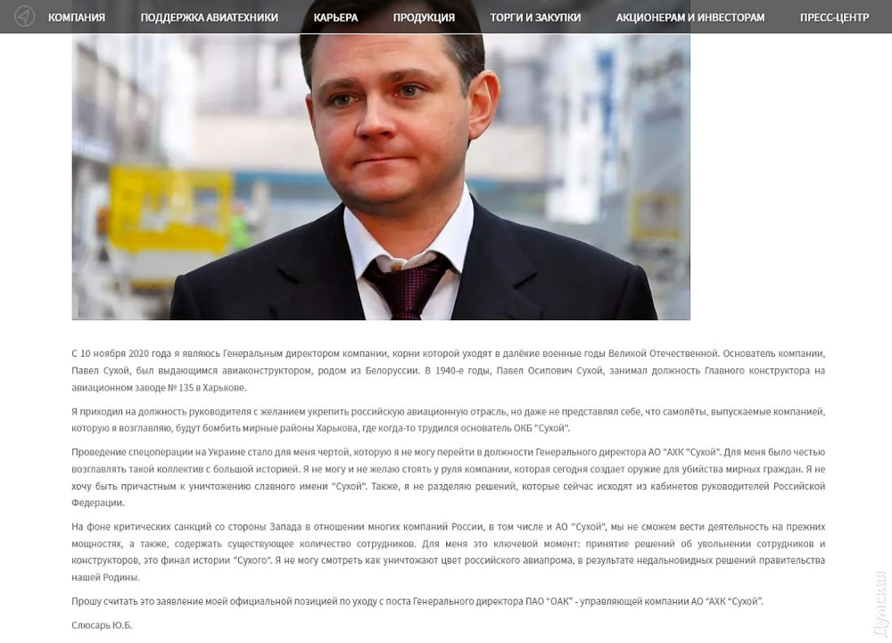Генеральный директор ведущей авиастроительной компании российских нацистов АО «АХК «Сухой» Юрий Слюсарь, которая производит военные самолеты, уволился из-за развязанной войны против Украины.