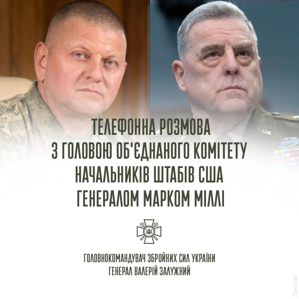 Головнокомандувач Збройних сил України генерал Валерій Залужний провів чергову телефонну розмову із Головою об'єднаного комітету начальників штабів США генералом Марком Міллі.