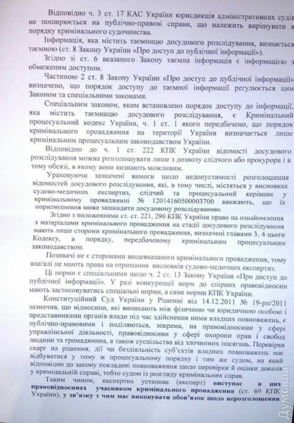 Напомним, ранее все три административные судебные инстанции подтвердили, что к заключениям экспертов, которые сделаны в рамках уголовного производства, существует большой общественный интерес. Представители милиции, прокуратуры и бюро СМЭ не смогли доказать необходимость ограничения доступа к этой информации в таких условиях.