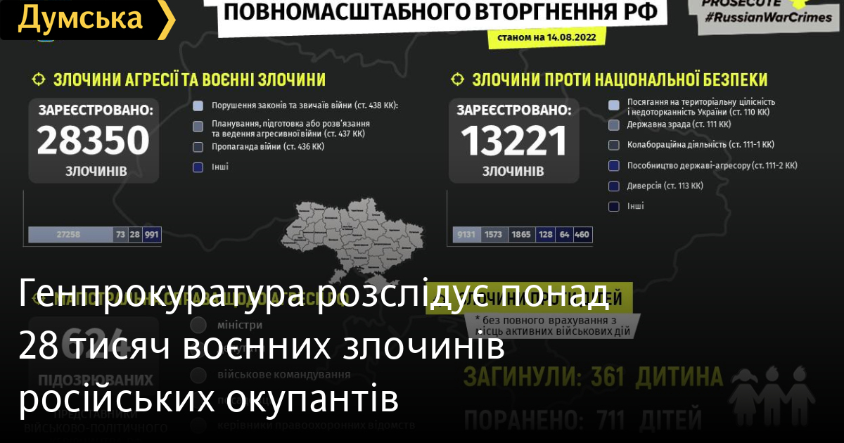 Генпрокуратура розслідує понад 28 тисяч воєнних злочинів російських окупантів28 231 воєнний злочин російської армії зафіксовано на території України за час повномасштабної агресії. Як повідомив Офіс генпрокурора України, 27 143 злочини пов'язані з порушенням законів та звичаїв війни, 73 – планування, підготовка або розв'язування та ведення агресивної війни, 28 – пропаганда війни, 987 – інші. Понад тисячу злочинів військовослужбовці країни-агресора вчинили стосовно українських дітей. З 24 лютого в Україні під час бойових дій загинула 361 дитина, 711 отримали поранення. Також за час повномасштабної війни українські правоохоронні органи зареєстрували 13 181 злочин проти національної безпеки, з них 9099 стосуються посягання на територіальну цілісність і недоторканність України, 1571 – держзрада, 1860 – колабораціоністська діяльність, 127 – допомога державі-агресору, 64 – диверсії, 460 – інші. СМЕРТЬ РОСІЙСЬКИМ ОКУПАНТАМ! Помітили помилку? Виділяйте слова з помилкою та натискайте control-enter |