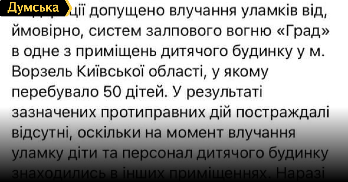 Генпрокурор: российские войска нанесли артудар по детскому дому в пригороде КиеваРоссийские войска нанесли артиллерийский удар по помещению детского дома в Ворзеле Киевской области. Об этом сообщила генеральный прокурор Ирина Венедиктова. По ее словам, в момент обстрела в учреждении находилось 50 маленьких украинцев. К счастью, пострадавших среди детей и персонала нет: они были в другом помещении. В ближайшее время воспитанников должны эвакуировать. СМЕРТЬ РОСІЙСЬКИМ ОКУПАНТАМ! Помітили помилку? Виділяйте слова з помилкою та натискайте control-enter |