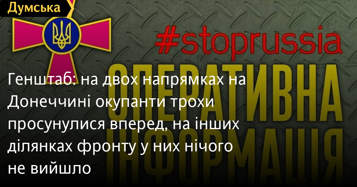 Генштаб: на двох напрямках на Донеччині окупанти трохи просунулися вперед, на інших ділянках фронту у них нічого не вийшлоРосійські нацисти мають частковий успіх у рамках наступу у напрямку Донецьк – Піски та сіл Кодема та Відродження у напрямку від Світлодарська до Бахмута. Про це повідомляється у зведенні Генерального штабу Збройних сил України. Противник 2 серпня намагався наступати і в інших напрямках. У районі Бахмута противник намагався просунутися в районі населених пунктів Роти, Вершина, Володимирівка, Яківна, Клинове, Зайцеве, Покровське і безпосередньо на Бахмут. Спроби окупантів виявилися безуспішними, вони зазнали втрат і були змушені відступити. Аналогічно завершився ворожий штурм у напрямку Мінеральне – Авдіївка у районі Донецька. На Харківському напрямку рашисти невдало намагалися покращити свої позиції у напрямі Тернової та Байрака. У напрямку Ізюму до Слов'янська, отримавши відсіч наших військ, ворожі розвідгрупи відступили у районі Долгенького і Долини. Вороги продовжують масовані артобстріли вздовж лінії фронту. СМЕРТЬ РОСІЙСЬКИМ ОКУПАНТАМ! Помітили помилку? Виділяйте слова з помилкою та натискайте control-enter |