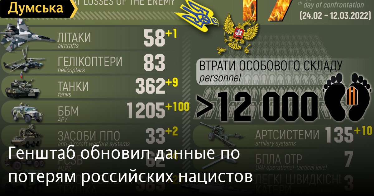 Генеральный штаб Вооруженных сил Украины обновил данные по потерям российских нацистов, понесенных ими с 24 февраля.