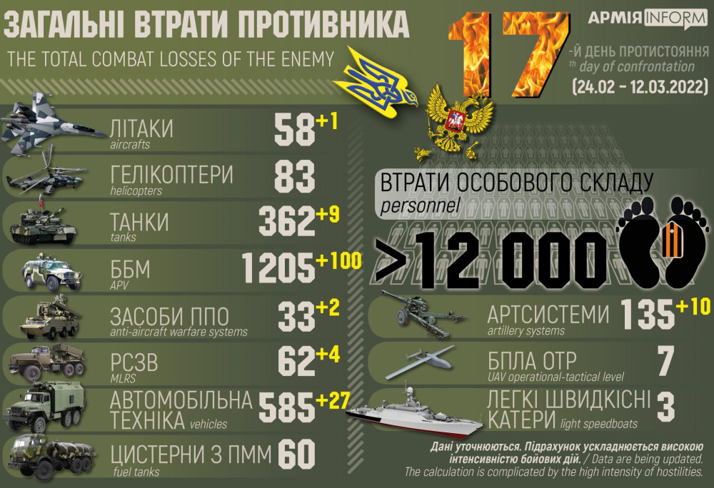 Украинские защитники уничтожили 362 танка, 1205 боевых бронированных машин, 135 единиц артиллерии, 62 системы РСЗО, 33 средства противовоздушной обороны, 58 самолетов, 83 вертолета, 585 автомобилей, два катера и один корабль, 60 цистерн с горючим, семь БПЛА оперативно-тактического уровня.