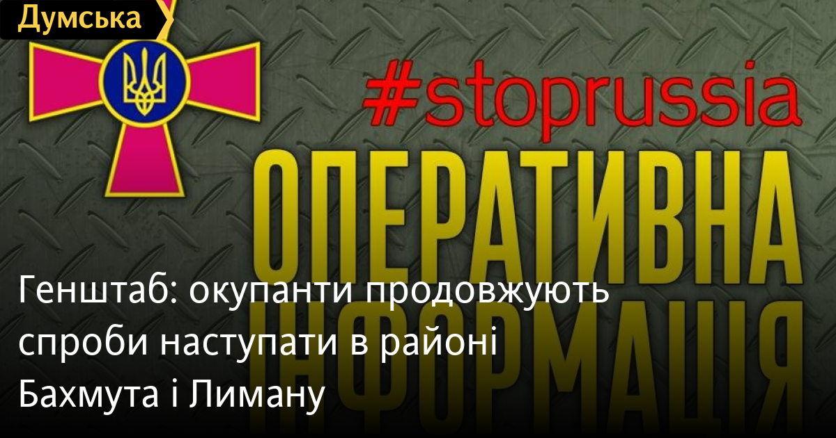 Генштаб: окупанти продовжують спроби наступати в районі Бахмута і ЛимануРосійські війська намагаються просунутися вперед у районі Бахмута і Лиману, а на куп'янському, авдіївському та запорізькому напрямках вживають заходів для поліпшення свого тактичного становища. У Генеральному штабі Збройних сил України повідомили, що 26 грудня противник не завдавав ракетних ударів, але 16 разів використовував реактивні системи залпового вогню. У відповідь наша авіація сьогодні завдала удару по скупченню ворожих військ, артилеристи та ракетні підрозділи Сил оборони вразили чотири пункти управління та шість районів зосередження ворожих сил. За встановленими даними, 24 грудня українські війська завдали удару по пункту зосередження ворожих сил у районі села Половинкине у Старобільському районі Луганської області — знищені або дістали поранення до 150 рашистів. 25 грудня на тимчасово окупованій території Херсонської області було знищено до 50 ворожих солдатів і офіцерів, до 100 поранено, також було знищено п'ять одиниць техніки ворога. Окупанти продовжують використовувати об'єкти цивільної інфраструктури для лікування своїх солдатів. У Біловодську Луганської області проходять лікування до 300 поранених найманців із ПВК «Вагнер». У Первомайську в ліцеї вороги організували госпіталь, у якому лікуються ще 300 окупантів, які дістали поранення в районі Бахмута. СМЕРТЬ РОСІЙСЬКИМ ОКУПАНТАМ! Помітили помилку? Виділяйте слова з помилкою та натискайте control-enter |