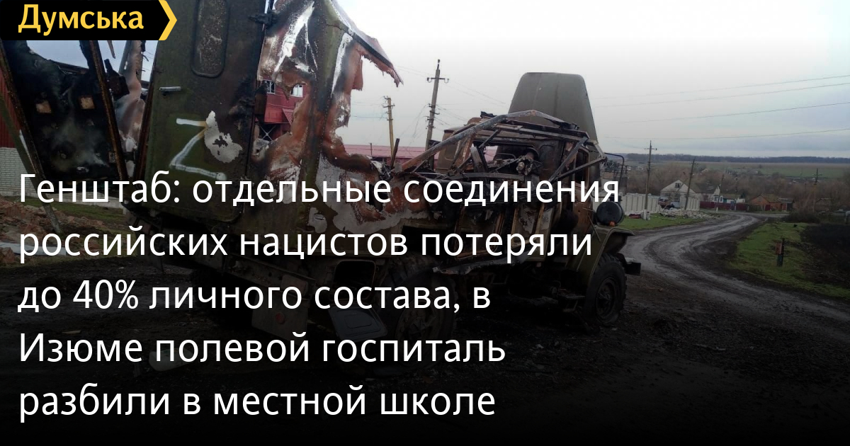 Потери 20-й мотострелковой дивизии (Камышин, Волгоградская область) — около 40% личного состава. Медиков центральной райбольницы в Глушкове Курской области перевели на усиленный режим дежурства из-за большого количества раненых в Сумской области оккупантов. А в украинском городе Пологи российские нацисты захватили и заминировали внутреннюю территорию центральной больницы.