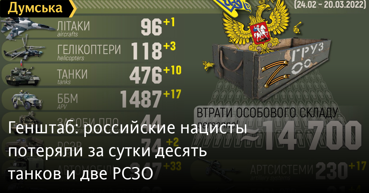 Так, с 24 февраля по 20 марта враг потерял примерно 14700 солдат и офицеров, 476 танков, 1487 боевых бронированных машин, 230 артсистем, 74 единицы РСЗО, 33 средства ПВО, 96 самолетов, 118 вертолетов, 947 автомобилей, два катера и один корабль, 60 цистерн с горюче-смазочными материалами, 21 БПЛА оперативно-тактического уровня, 12 единиц специальной техники.
