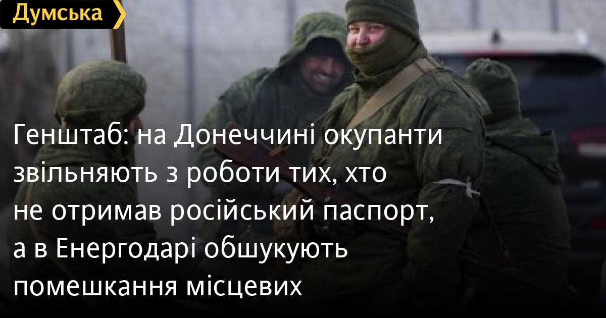 Генштаб: на Донеччині окупанти звільняють з роботи тих, хто не отримав російський паспорт, а в Енергодарі обшукують помешкання місцевихПрацівників міської лікарні у Сніжному Донецької області звільнили з роботи за те, що вони не отримали російські паспорти. Як повідомляється в ранковому зведенні Генштабу, в Енергодарі Запорізької області місцеві жителі повинні отримувати дозвіл на пересування територією області. Ті, хто подав заявки на отримання перепусток, піддаються посиленій перевірці з боку окупантів на предмет причетності до сил оборони України. Подекуди загарбники обшукують навіть людські помешкання. Ворог протягом минулої доби завдав 39 авіаційних та сім ракетних ударів. Також він здійснив 47 обстрілів з реактивних систем залпового вогню по позиціях наших військ та цивільній інфраструктурі населених пунктів. Противник продовжує зосереджувати основні зусилля на веденні наступальних дій на лиманському, бахмутському, авдіївському та мар’їнському напрямках. За день наші захисники відбили 52 атаки на зазначених напрямках. Авіація Сил оборони за минулу добу завдала вісім ударів по районах зосередження особового складу та військової техніки окупантів, а також удару по зенітно-ракетному комплексу противника. Підрозділи ракетних військ і артилерії уразили район зосередження живої сили, озброєння та військової техніки, а також склад боєприпасів противника. СМЕРТЬ РОСІЙСЬКИМ ОКУПАНТАМ! Помітили помилку? Виділяйте слова з помилкою та натискайте control-enter |