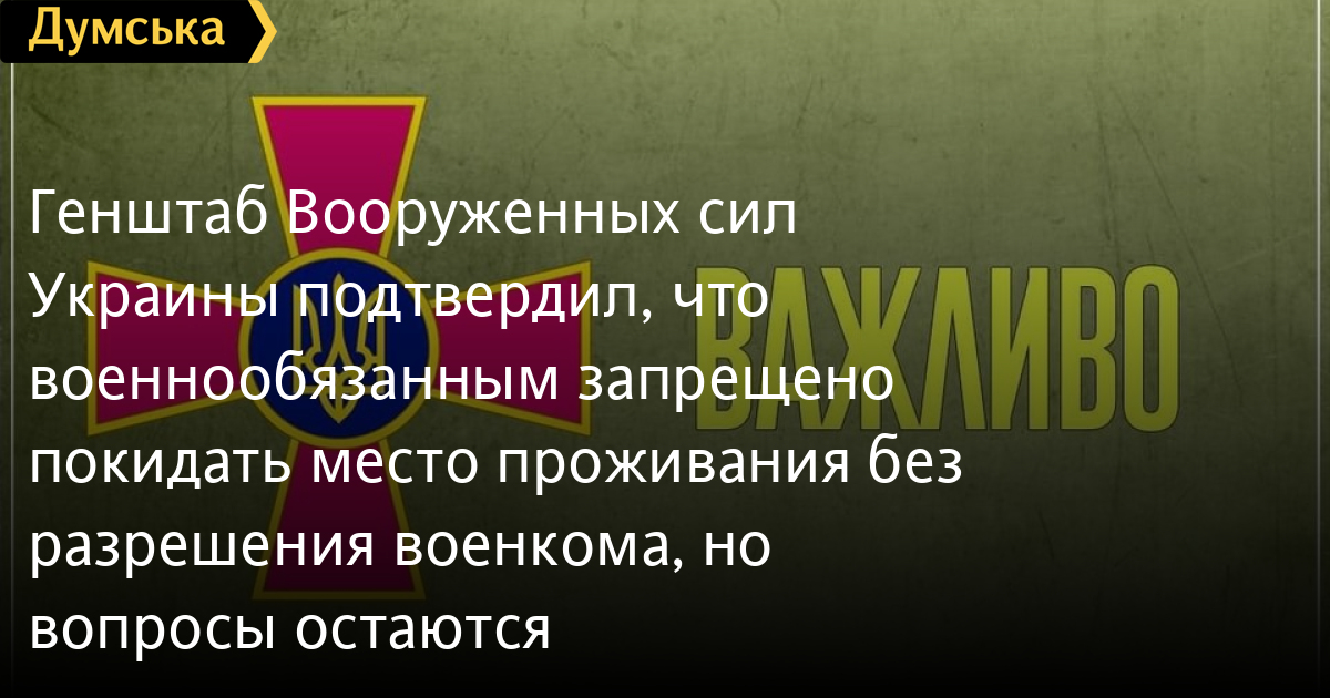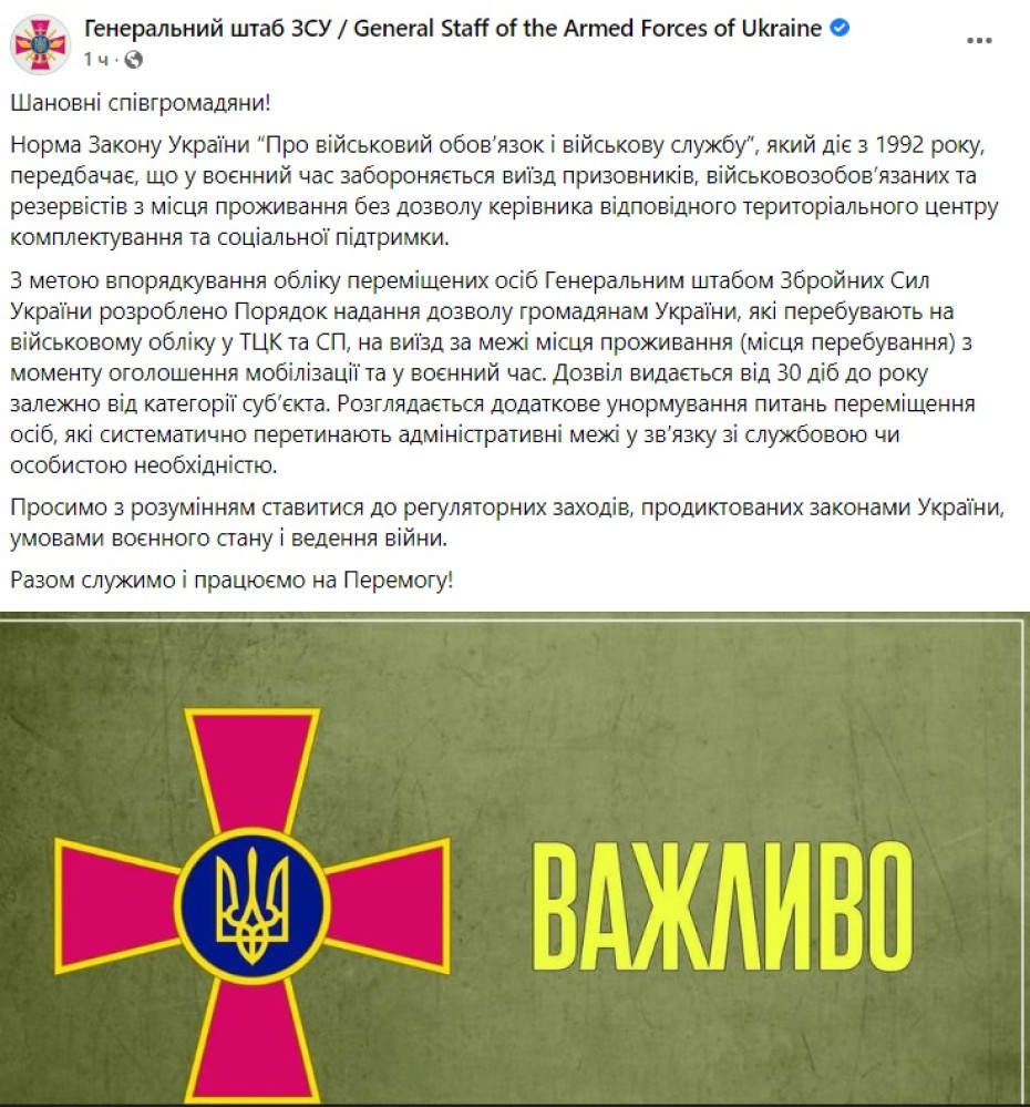 Генеральный штаб Вооруженных сил Украины прокомментировал информацию о запрете военнообязанным покидать место жительства без разрешения военкоматов (территориальных центров комплектования и социальной поддержки).