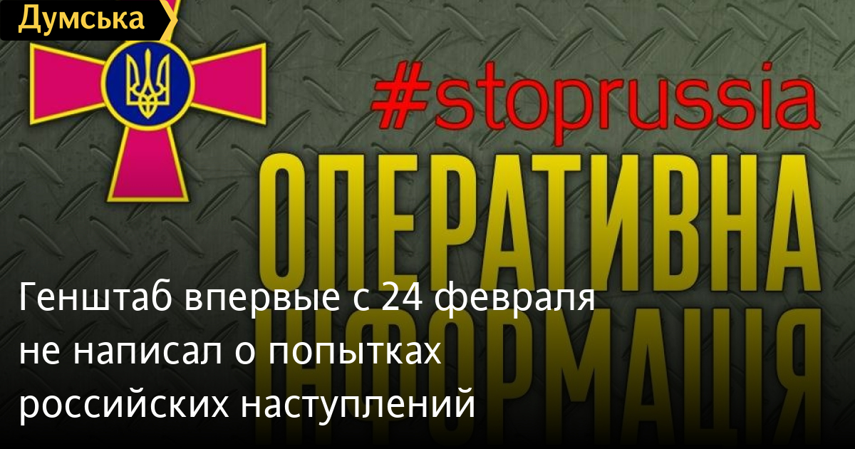 Генштаб вперше з 24 лютого не написав про спроби російських наступівГенеральний штаб Збройних сил України вперше з початку повномасштабної війни опублікував зведення оперативної обстановки, в якому немає жодної згадки про вдалі чи невдалі наступи противника. У зведенні зазначено, що рашисти продовжують обстріли населених пунктів на північному, слобожанському, краматорському, авдіївському та бахмутському напрямках, а також у Запорізькій та Херсонській областях. Протягом дня вороги завдали одного ракетного та 15 авіаційних ударів, здійснили 22 обстріли з реактивних систем залпового вогню. Наша авіація здійснила 19 ударів по позиціях окупантів. Уражено 13 місць зосередження живої сили та техніки рашистів, шість комплексів ППО. Збито вісім ворожих безпілотників, з них шість дронів-камікадзе Shahed -136. Українські ракетні війська вразили два пункти управління противника, три райони зосередження ворожих сил, два склади боєприпасів. Уточнено поразки 12 жовтня двох ворожих об'єктів у районі населеного пункту Бурчак у Запорізькій області. СМЕРТЬ РОСІЙСЬКИМ ОКУПАНТАМ! Помітили помилку? Виділяйте слова з помилкою та натискайте control-enter |