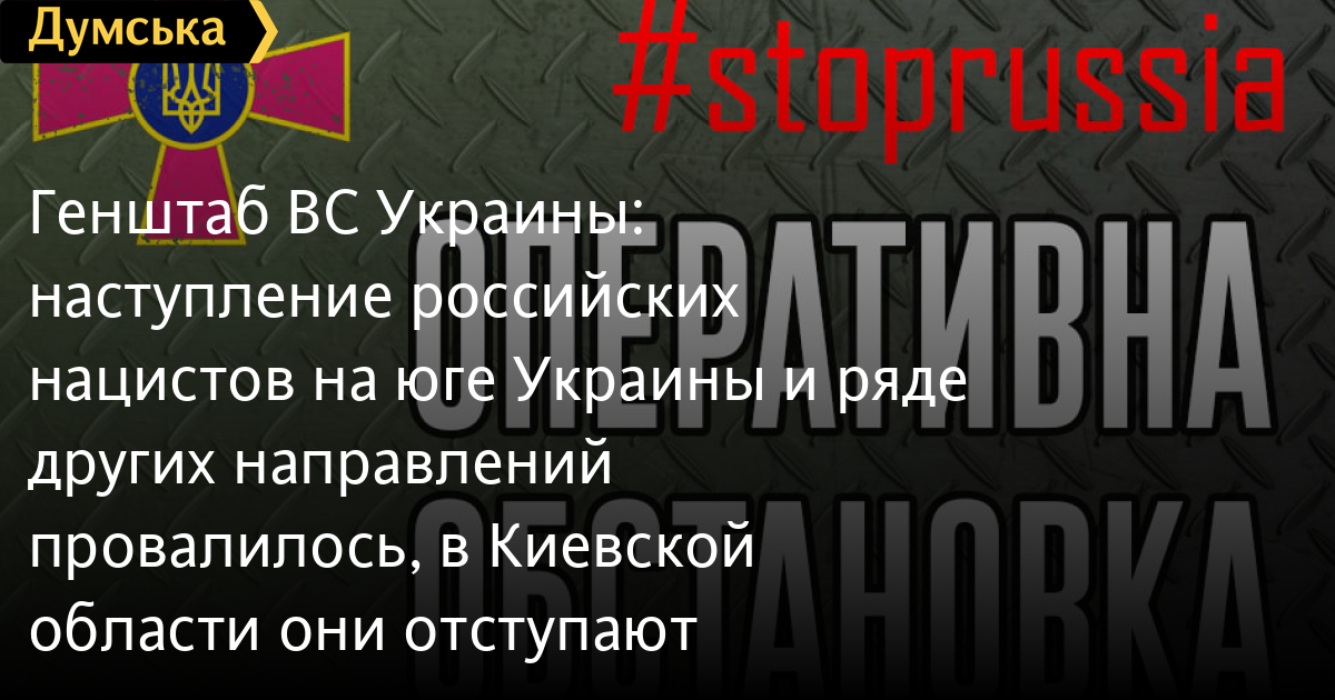 Генштаб ВС Украины: наступление российских нацистов на юге Украины и ряде других направлений провалилось, в Киевской области они отступаютГенеральный штаб Вооруженных сил Украины обнародовал оперативную информацию о ситуации на фронтах по состоянию на 12:00 пятницы. Противник, понеся потери в Полесском, Северском, Южнобугском оперативных районах, остановлен, пытается закрепиться, причем вынужден делать это на невыгодных рубежах. На донецком направлении в ходе жестоких боев защитники Украины дали отпор врагу, темп наступления захватчиков замедлен. Главными направлениями сосредоточения усилий противника остаются Киев и Мариуполь. Кроме того, нацисты пытаются продвинуться в направлении Кривого Рога, Кременчуга, Никополя и Запорожья. Не имея возможности достигнуть успеха, враг продолжает наносить ракетно-бомбовые удары по городам, находящимся в глубине территории Украины – Днепру, Луцку и Ивано-Франковску. Продолжается формирование резервов противника и переброска их к районам боевых действий на территории Украины. Отмечается наращивание системы противовоздушной обороны группировки войск оккупантов на донецком и таврийском направлениях. На Волыни сохраняется угроза осуществления диверсий на объектах военной и гражданской инфраструктуры. На полесском направлении оккупанты не проводят активных наступательных действий, осуществляют мероприятия по восстановлению боеспособности подразделений. В результате активных и согласованных действий подразделений Вооруженных сил Украины и других составляющих Сил обороны противник понес значительные потери, что вынудило его отступить из ранее захваченных пунктов Киевской области. На северском направлении активные наступательные действия противник не ведет. На отдельных участках враг осуществил огневые налеты и провел разведку позиций подразделений Вооруженных сил Украины. На слобожанском направлении противник продолжает удерживать в окружении Сумы и частично осуществляет блокирование Харькова с севера. Проводит перегруппировку войск. На донецком и таврийском направлениях оккупанты не оставляют попыток захвата Мариуполя и Северодонецка, но без особого успеха. Планы относительно установления контроля над Николаевом, продвижения на Запорожье и Кривой Рог противником не реализованы. Из-за значительных потерь нацисты вынуждены перейти к обороне. СМЕРТЬ РОССИЙСКИМ ОККУПАНТАМ! Заметили ошибку? Выделяйте слова с ошибкой и нажимайте control-enter |