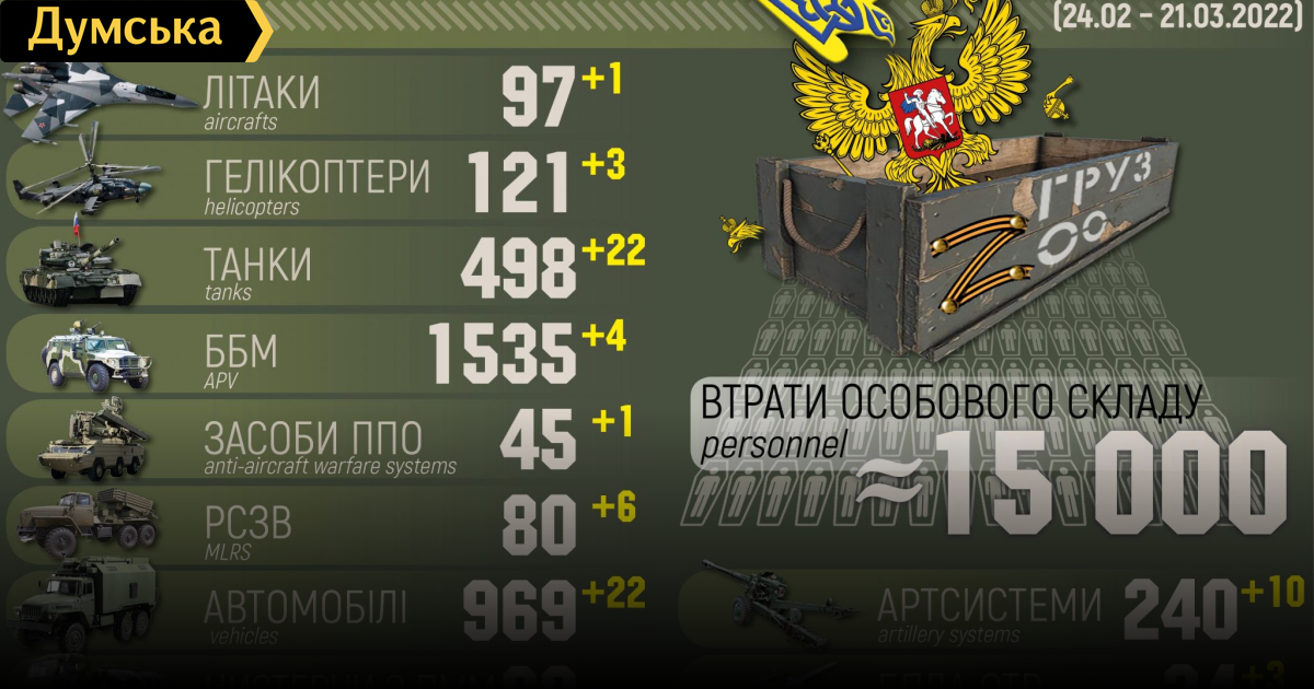 Генштаб ВС Украины: российские нацисты потеряли уже около 15 тыс. военнослужащих (инфографика)Потери российских нацистов в Украине составляют около 15 тыс. военнослужащих. Об этом сообщили в Генштабе Вооруженных сил Украины. Кроме того, с 24 февраля враг потерял 498 танков, 1535 боевых бронированных машин, 240 артсистем, 80 РСЗО, 45 средств ПВО, 97 самолетов, 121 вертолет, 969 автомобилей, один корабль и два катера, 60 цистерн с ГСМ, 24 БПЛА оперативно-тактического уровня, 13 единиц специальной техники. За минувшие сутки украинские защитники уничтожили один самолет, три вертолета, 22 танка, четыре ББМ, одно средство ПВО, шесть РСЗО, 22 автомобиля, одну единицу спецтехники, десять артсистем и три БПЛА. СМЕРТЬ РОСІЙСЬКИМ ОКУПАНТАМ! Помітили помилку? Виділяйте слова з помилкою та натискайте control-enter |
