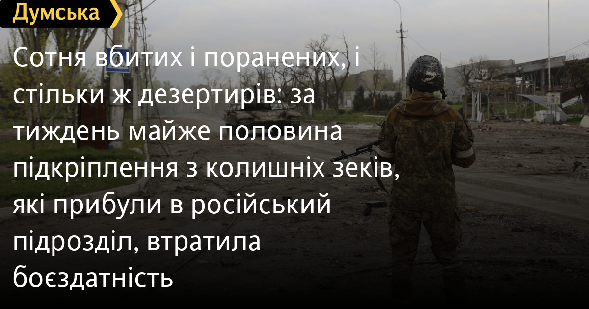 Російські окупанти продовжують зазнавати значних втрат в Україні та намагаються компенсувати їх колишніми ув'язненими, однак через погану підготовку та низьку мотивацію цей контингент дуже швидко втрачає боєздатність.