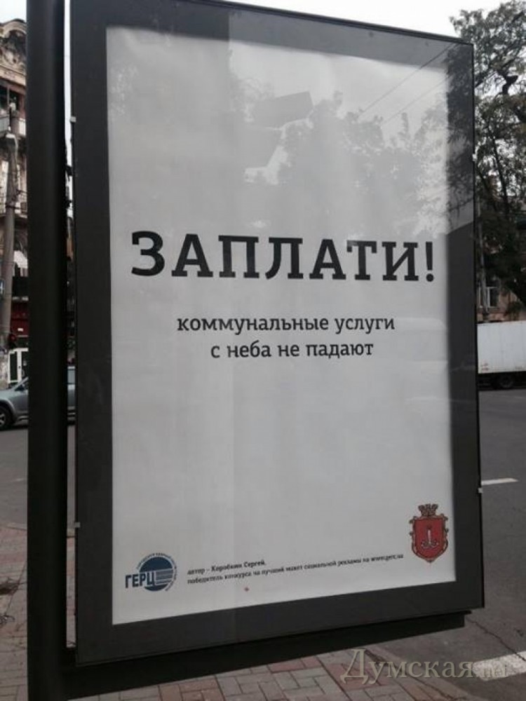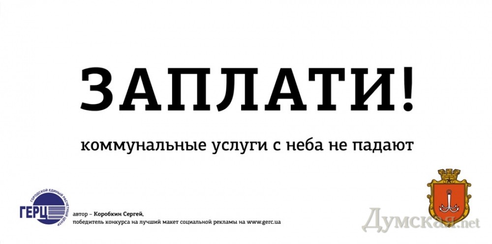 Городской единый расчетный центр (ГЕРЦ) выбрал самый лучший макет социальной рекламы, призывающей одесситов погасить задолженность за коммунальные услуги. Победителем конкурса, который, как мы писали ранее, проводился в августе, стал начинающий дизайнер Сергей Коробкин. Его вариант призыва, который оказался к тому же самым лаконичным, уже размещен на ситилайтах в центре города. СМЕРТЬ РОСІЙСЬКИМ ОКУПАНТАМ! Помітили помилку? Виділяйте слова з помилкою та натискайте control-enter |